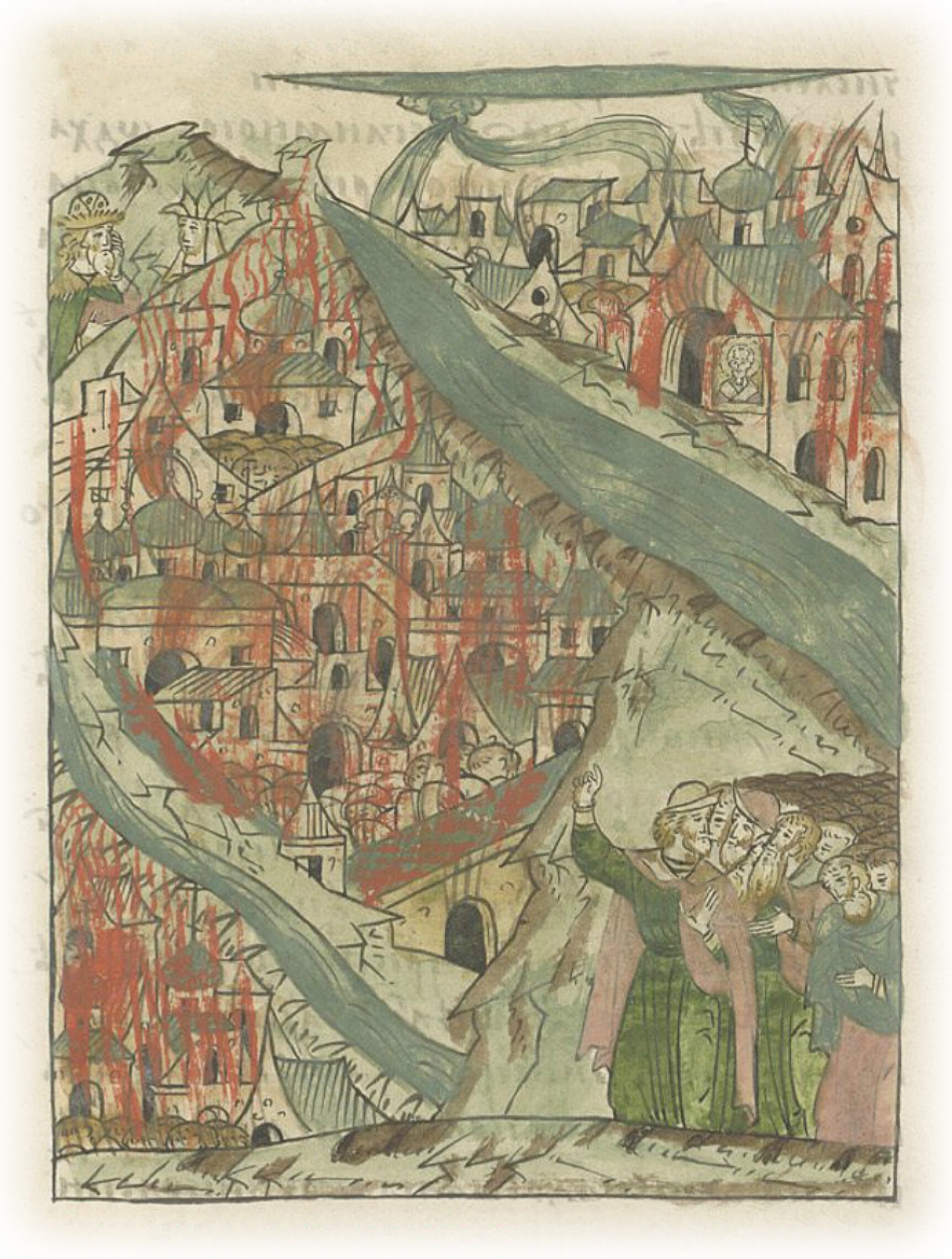 О великом пожаре в Москве. В том же месяце июле в 28 день в воскресенье в 7 часов дня загорелась от свечи церковь святого Николы на Песке, и в тот час началась сильная буря, и кинуло огонь на другую сторону реки Москвы к церкви Всех святых, а оттуда за Неглинную к каменной церкви святого Георгия; и в тот час началась буря, и начало гореть во многих местах, и выгорел посад за Неглинной от церкви Духа Святого до Чертолья и до церкви Бориса и Глеба на Арбате, и до Петровской слободки; а за рекой Москвой выгорело от церкви Софии (Премудрости Божьей) до церкви (святых) Иоакима и Анны. А из Заречья в городе загорелся двор великого князя и великой княгини, и оттуда загорелись житницы на Подоле, и новый двор великого князя за церковью архангела Михаила сгорел, и митрополичий двор выгорел, и у церкви Успения Пречистой (Богородицы) алтарь обгорел под немецким железом, и в городе все лачуги выгорели, где не успели поставить хоромы после весеннего пожара; и церковь Иоанна Предтечи у Боровицких ворот сгорела и обвалилась, а в церкви поп сгорел, а под церковью казна великой княгини выгорела; и Боровицкая стрельница выгорела, и у городской стены вся кровля выгорела, и новая деревянная стена у Никольских ворот. А из города торг загорелся, и оттуда посад выгорел возле реки Москвы до Зачатьевской церкви на Востром конце и до Васильевского луга, и до церкви Всех святых на Кулишках, и оттуда до церкви Иоанна Богослова и по старую Троицу, и Сретенская улица вся выгорела до Всполья, и каменная церковь Сретение обгорела. И тогда людям много скорби было: более 200 человек сгорело, а имущества бесчисленно выгорело; а все то сгорело в один день от полудня до ночи; а летописец и старые люди сказывают: как Москва была основана, такого пожара в Москве не бывало.