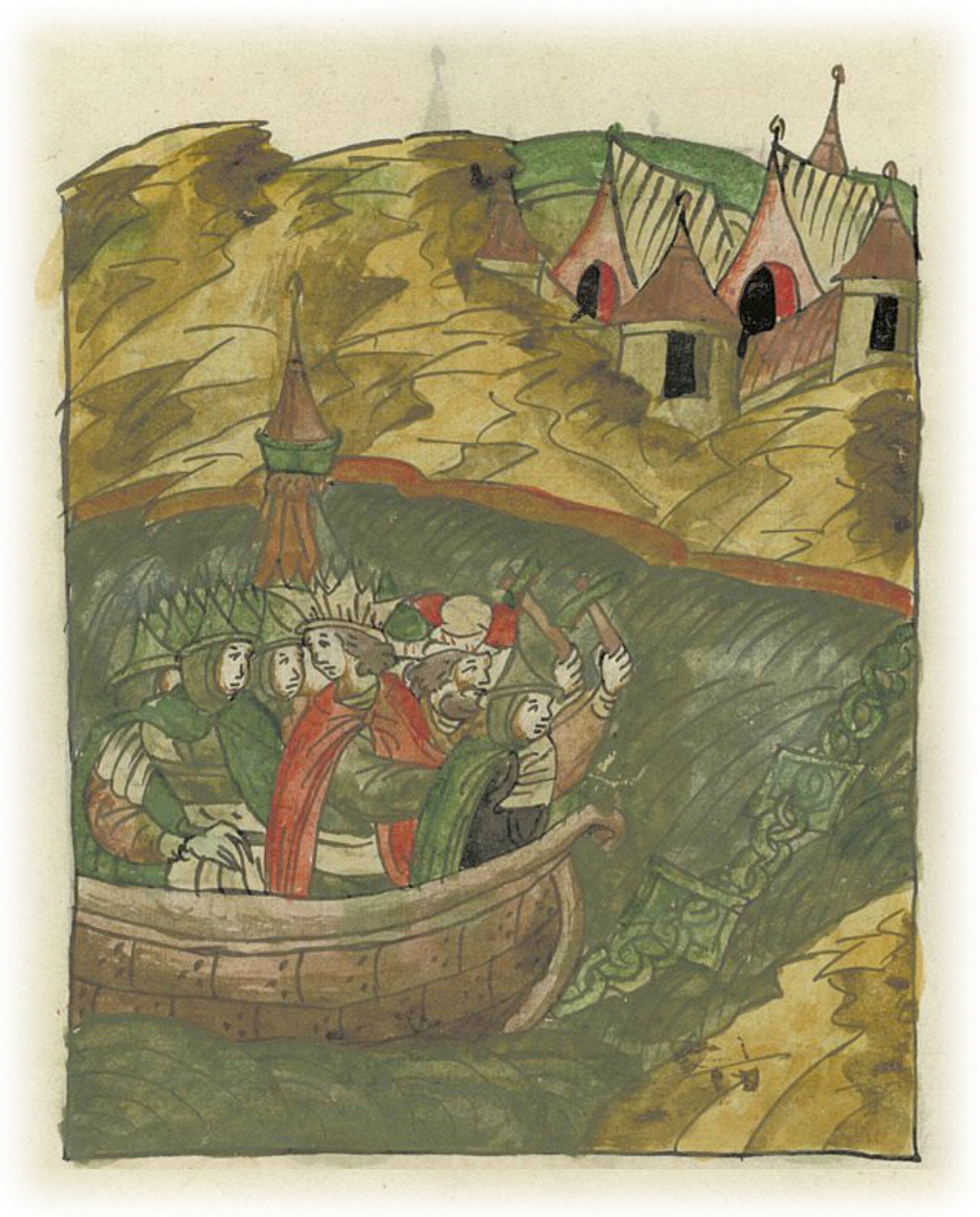 Латиняне, желая получить золото и серебро, которое им обещал Исаакович, забывают наставления папы не причинять зла Греческой земле и, прийдя в Суд, разбивают железные замки и приступают к городу.