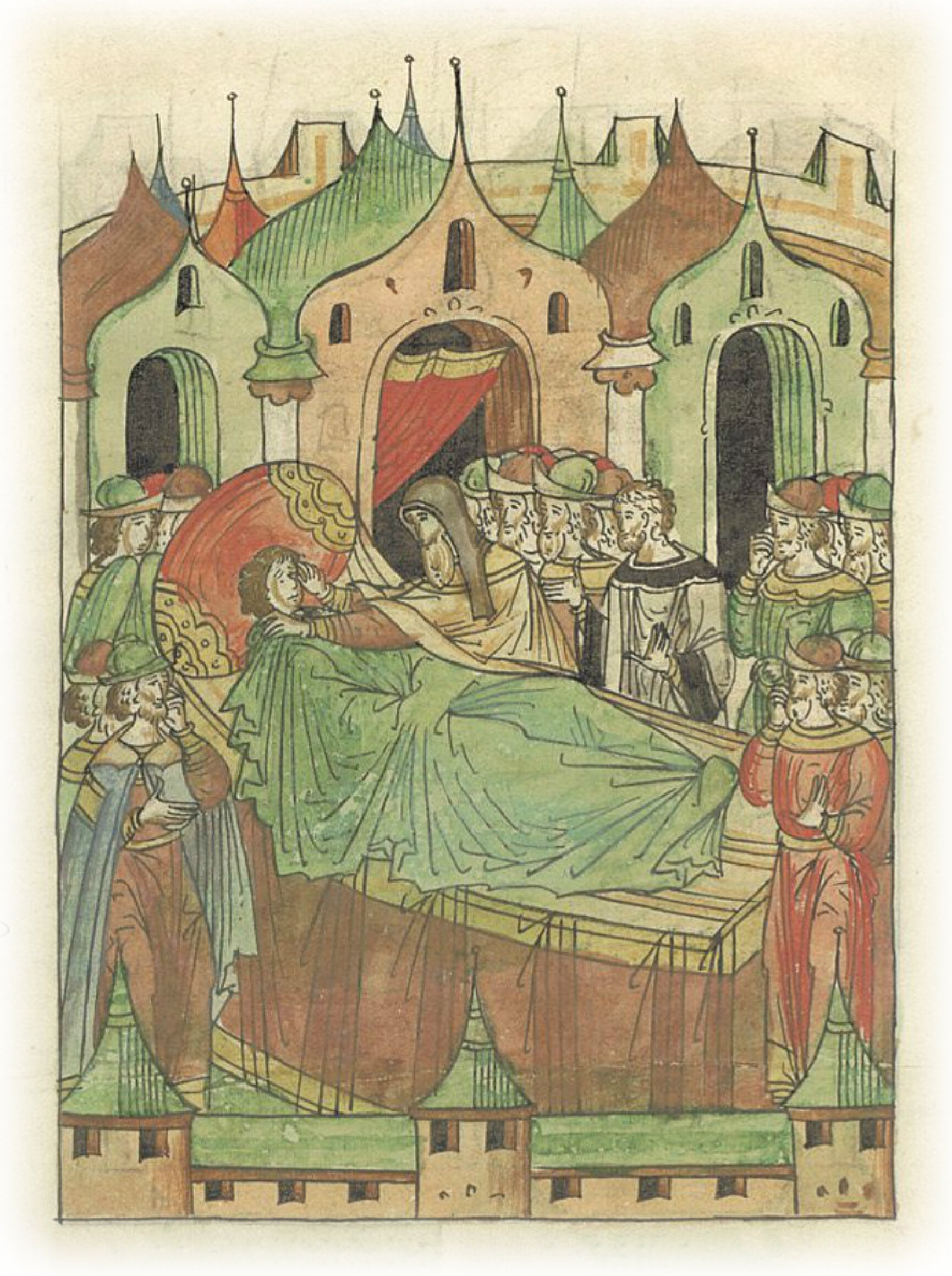 О кончине князя Дмитрия Юрьевича Красного. Духовный отец Иосия закрывает глаза умершему князю.