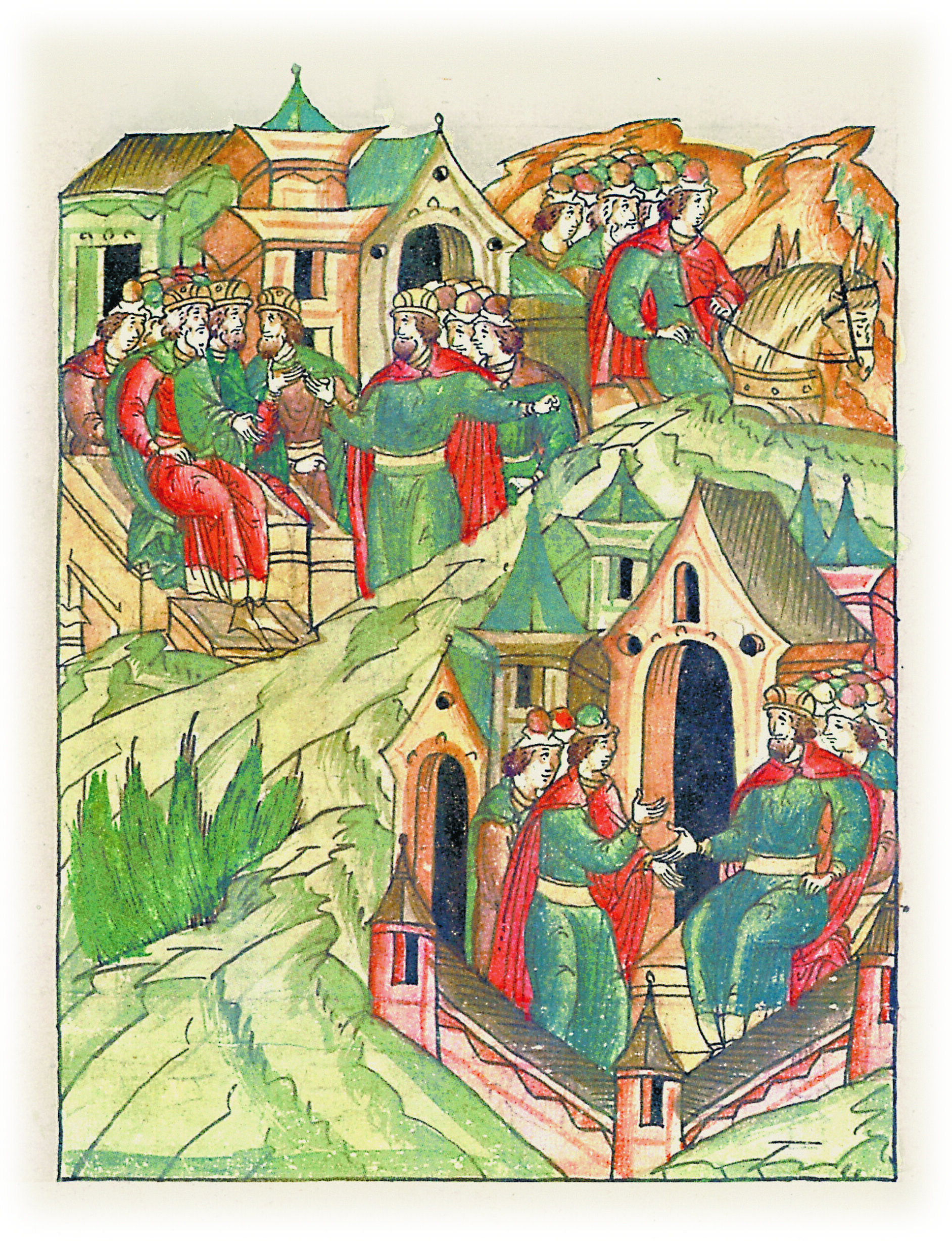Князь Святослав Всеволодович рассказывает Давыдовичам о сомнениях великого князя Изяслава Мстиславича. Они посылают в Киев, уговаривая того не медлить и идти на Святослава Олеговича.