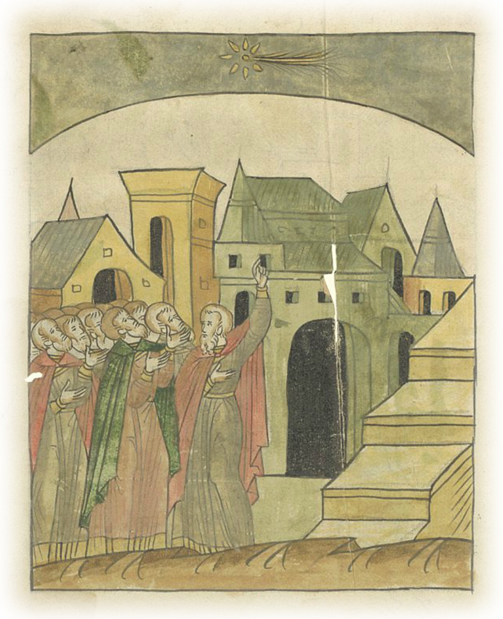 Знамение о звезде. Того же месяца декабря после Рождества Христова явилась на небе звезда великая, и от нее (шел) луч очень длинный, толстый, светлый, светлее самой звезды; а восходила в шестом часу ночи с летнего восхода* солнечного и шла к западу летнему**, а луч от нее вперед протянулся, а конец луча того как хвост великой птицы был распростерт. * северо-восток; ** северо-запад.