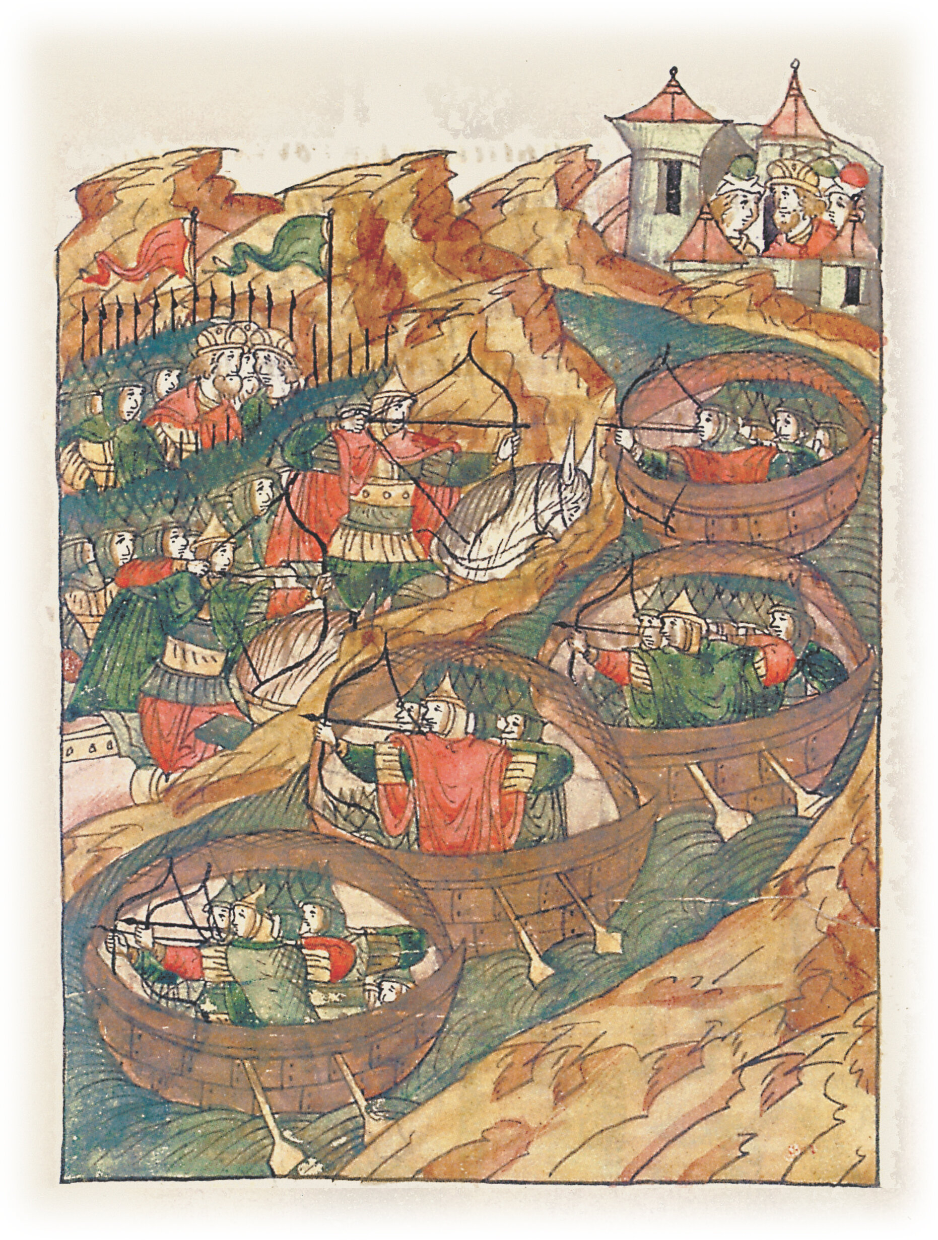 Князь же великий Киевский Изяслав Мстиславич и князь великий Вячеслав Владимирович Мономаш встали крепко против них и не давали им перейти реку Днепр, и бились с ними на воде, в ладьях плавая, ибо князь великий Изяслав Мстиславич дивно придумал бой в ладьях, так что гребцы в ладьях невидимы были, весла только немного были видны, а люди не видны, и стрелы от них летели на противников, а к ним не прилетали, ибо покрыты были досками очень хитро;