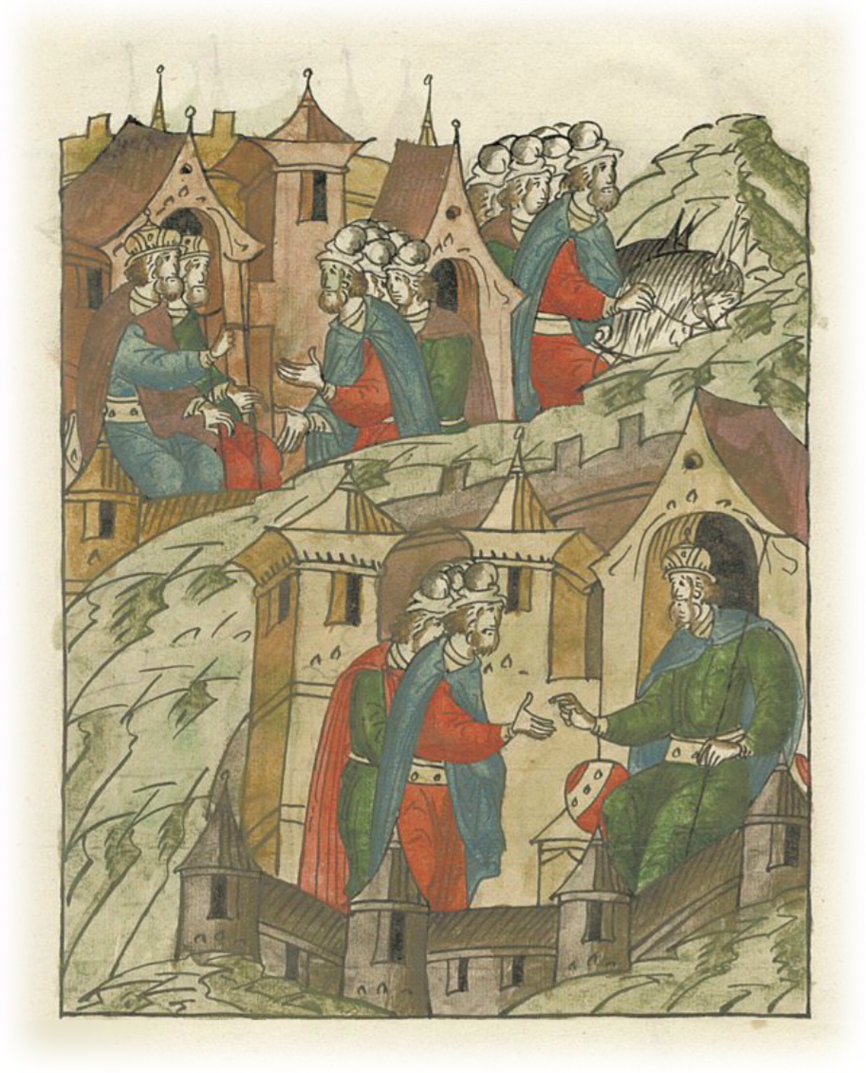 Ругодивские посадники Яким и Захар приезжают в Москву. Воеводы царя Ивана Васильевича Алексей Адашев и Иван Михайлов сообщают им, что государь пожалует их, если сдадут его воеводам помимо Ругодива Вышгород.