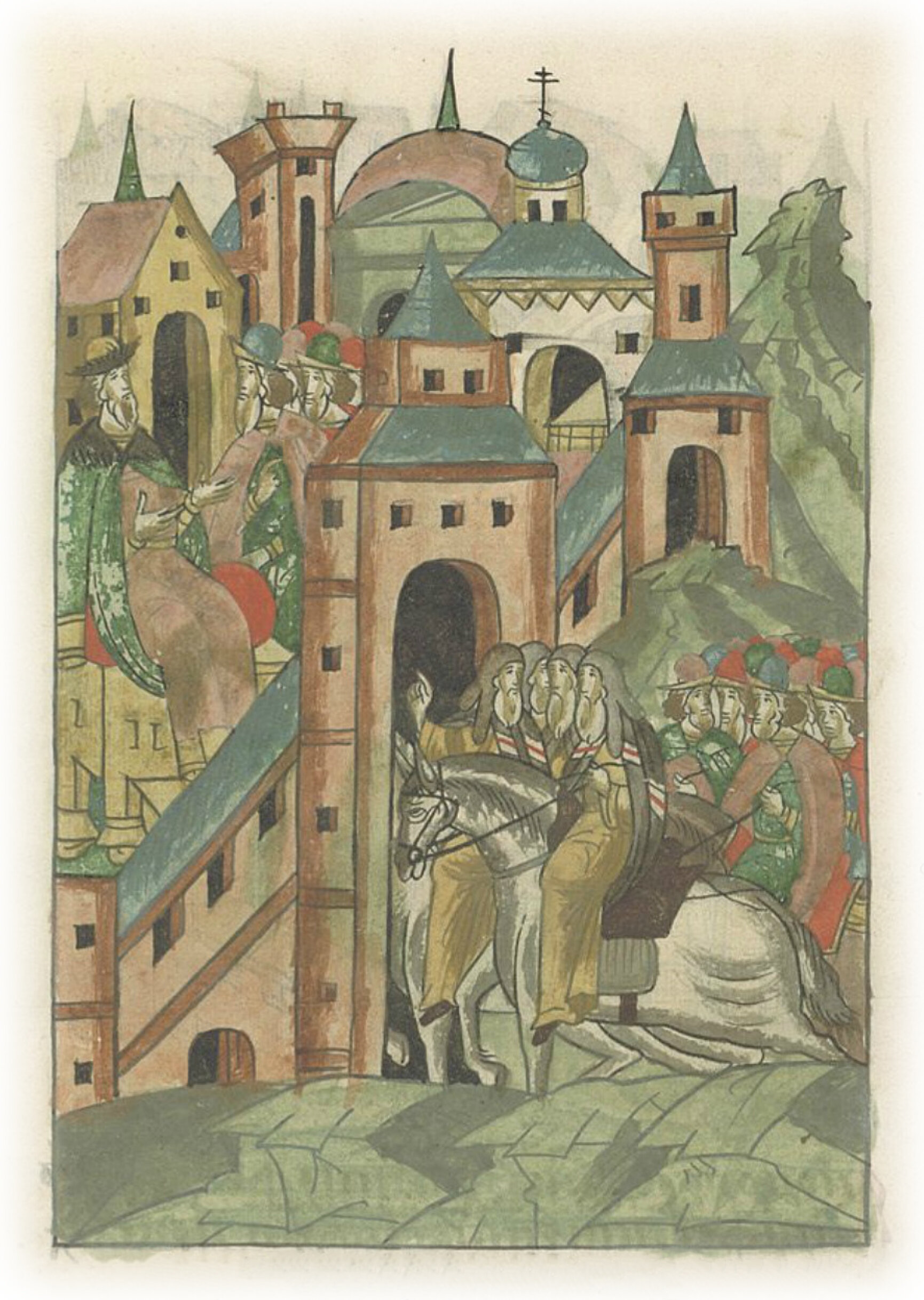 Ростовский архиепископ Вассиан, Суздальский епископ Евфимий, Рязанский епископ Феодосий, Коломенский епископ Геронтий, Сарский епископ Прохор приходят к великому князю Ивану Васильевичу.