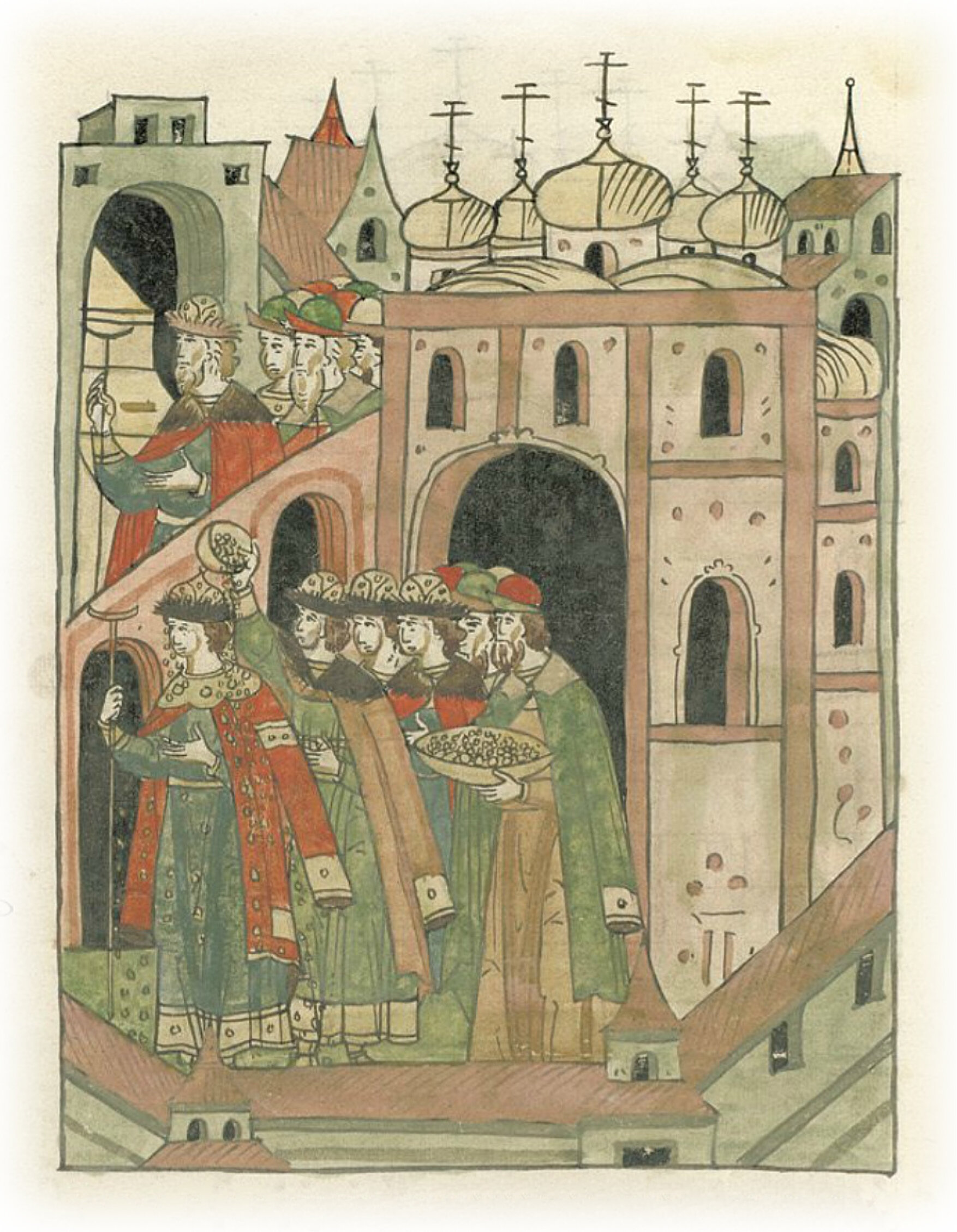 пошел великий князь Иван к себе, а великий князь Дмитрий в шапке и в бармах только из дверей церкви Пречистой (Богородицы) вышел, как его тут же трижды осыпал золотыми и серебряными деньгами сын великого князя князь Юрий, а дети великого князя шли рядом с ним и все бояре;