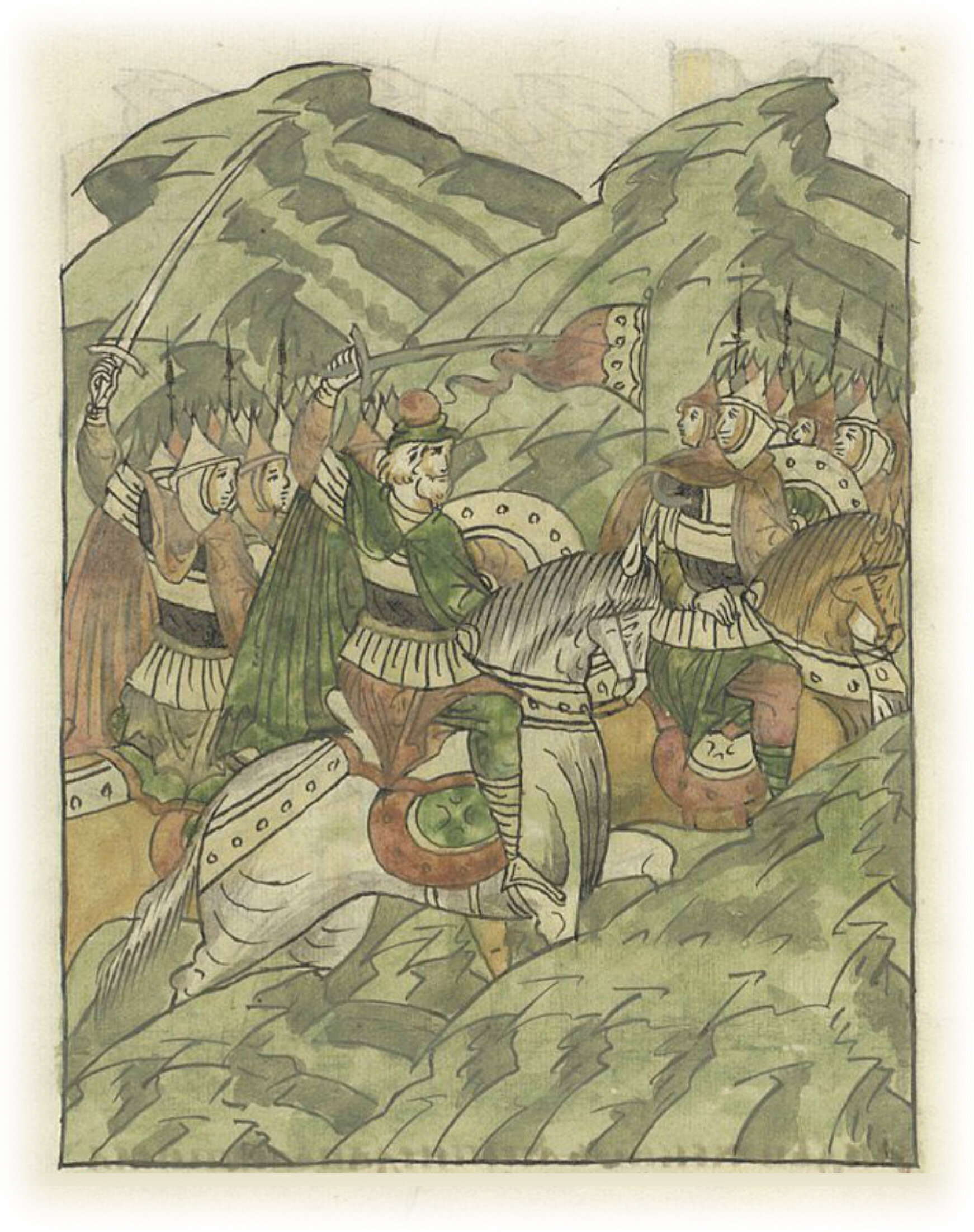 О побоище князя Ярослава Всеволодовича с князем Новгородским Мстиславом Мстиславичем у Липицы. Пешие новгородцы подсекают стяг князя Ярослава Всеволодовича. Воевода Ивор с конными смолянами пробиваются к другому стягу.