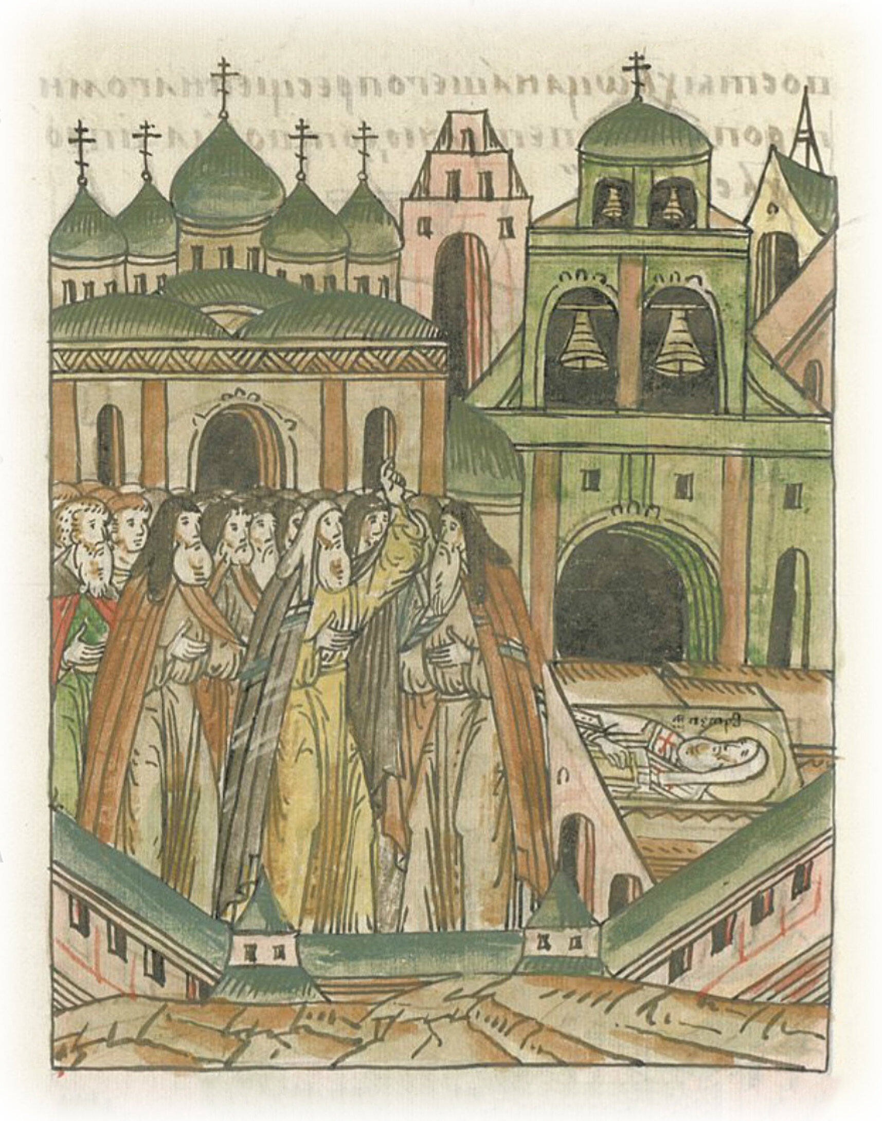 а в 23 день того же месяца перед вечернею отпеть молебен там, да внести цельбоносные мощи чудотворца Петра в новую и великую церковь Успения святой Богородицы, и поставить его среди церкви той, и петь вечерню и молебен, и утреню с восхвалением; и как наступит время литургии, и, пев молебен, в 24 день того же месяца принести и поставить его на приготовленном для него месте у святого жертвенника поверх помоста, и не закладывать ничем, и так быть литургии. А о тех святителях прежденазванных, митрополитах русских Феогносте и Киприане, и Фотии, и Ионе, и Филиппе так замыслили: чтобы того же месяца в 27 день в пятницу перед вечерней принести всех их в новую церковь на приготовленные для них места, и, отпев вечерню, петь панихиду по ним, а наутро в субботу с епископами и с прочими священниками – служить литургию по ним.