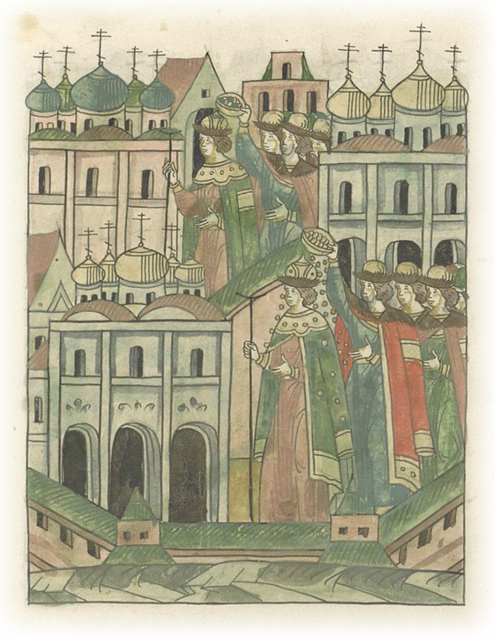 Возведение на престол внука великого князя Ивана Васильевича, князя Дмитрия Ивановича, в церкви Пречистой Богородицы в Москве.