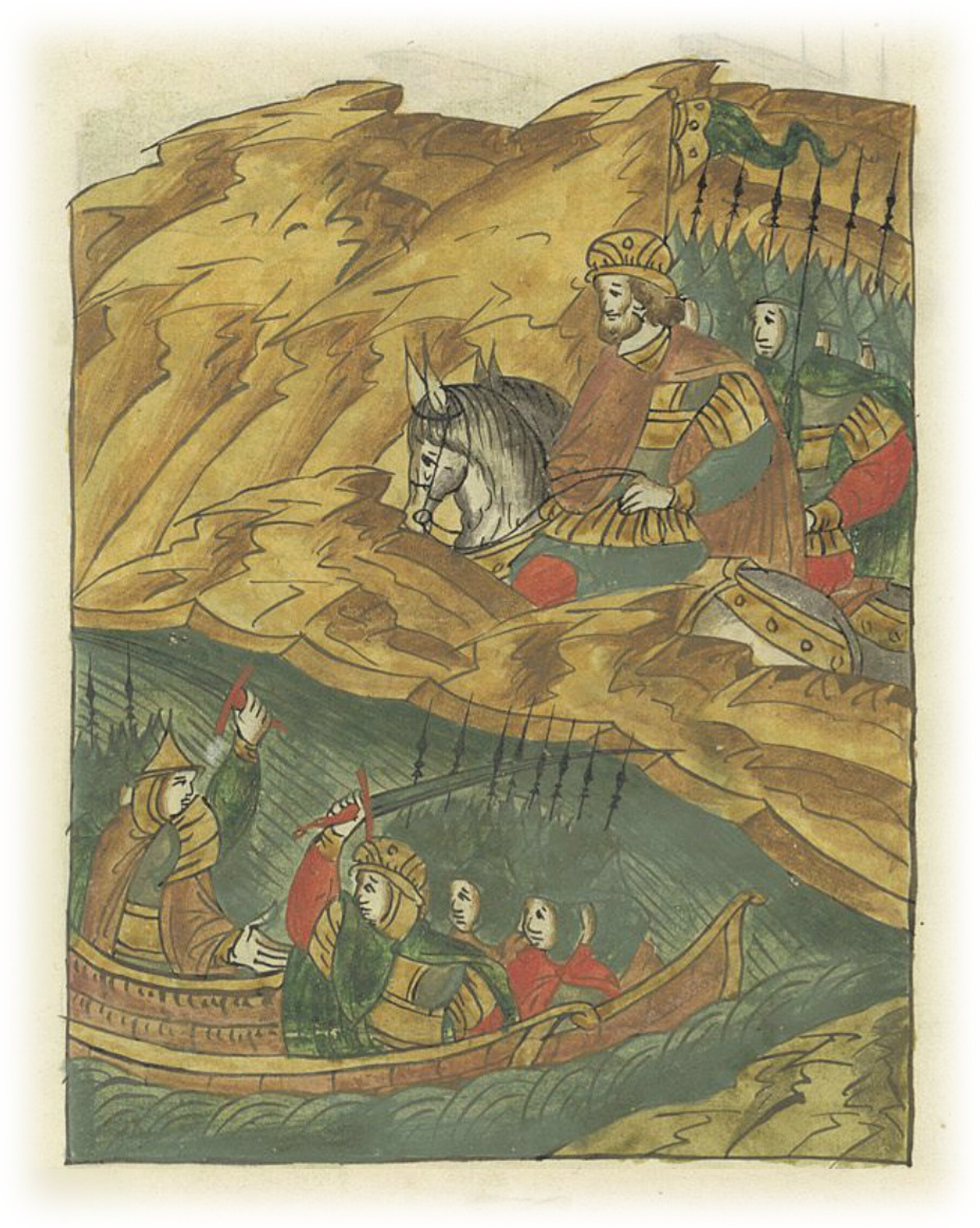 И, когда были они у Ожска, пришла к ним весть, что вышел из Рязани князь Роман, сын Игорев, внук Глебов, и бьется с ладейниками у Ольгова.