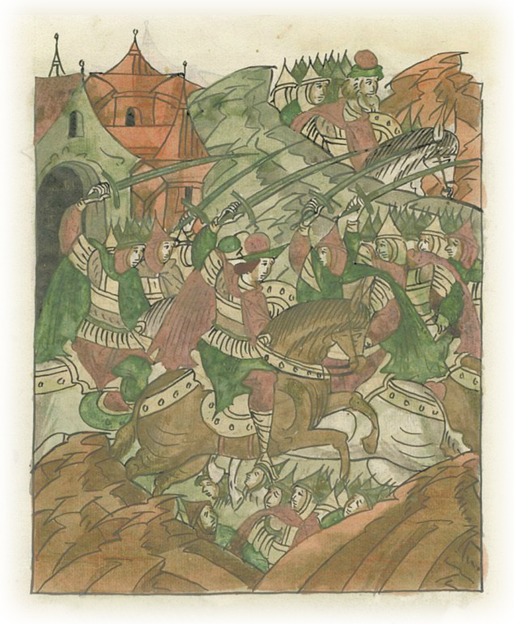 Но Божьею помощью и пречистой Его матери князья и бояре смоленские, и все горожане с воеводами великого князя и со всеми людьми единодушно и крепко стояли против литовских людей, из города часто выходили и с ними крепко бились. Безбожный же Острожский князь Константин, государев изменник, у города Смоленска стояв, не сумел ничего и возвратился с великим срамом.