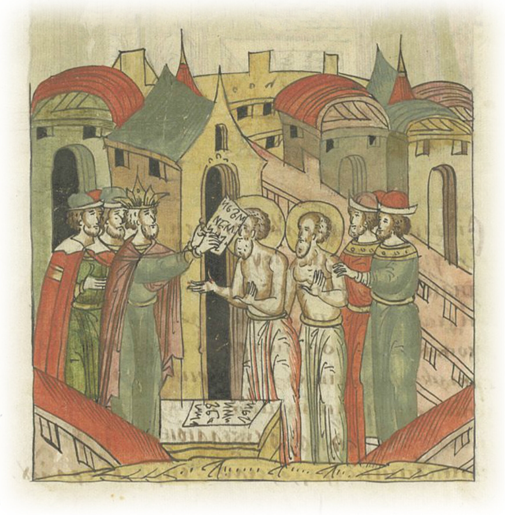 Краткое сказание о латинянах. Двум выжившим после мук ученикам протосингела Михаила, Федору и Феофану, выжигают на лицах слова царя Феофила и отправляют в заточение.