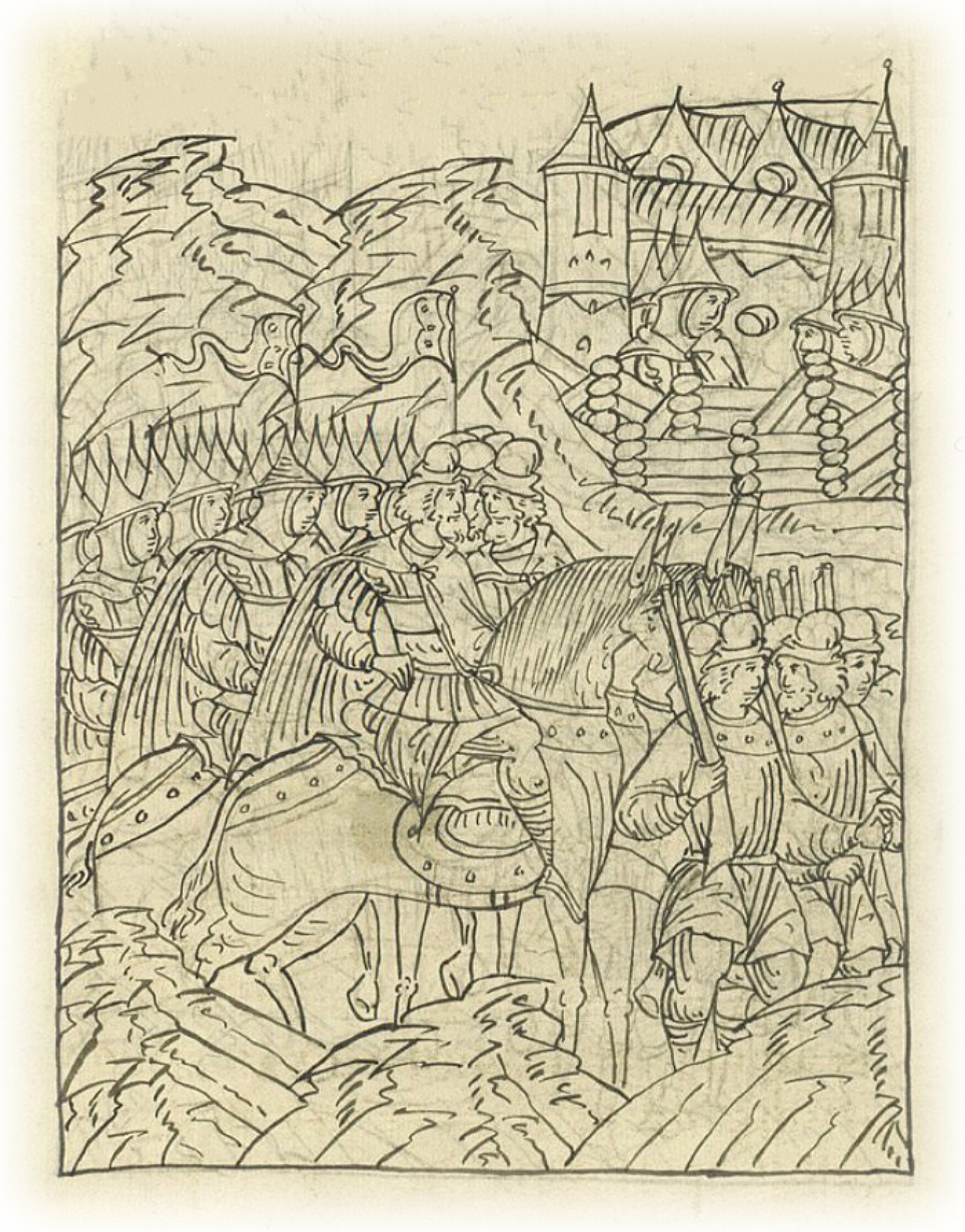 Языки говорят воеводам царя Ивана Васильевича, что магистр окопался большим рвом вокруг города Рындола, бьет из пушек и пищалей и приступает к Рындолу.