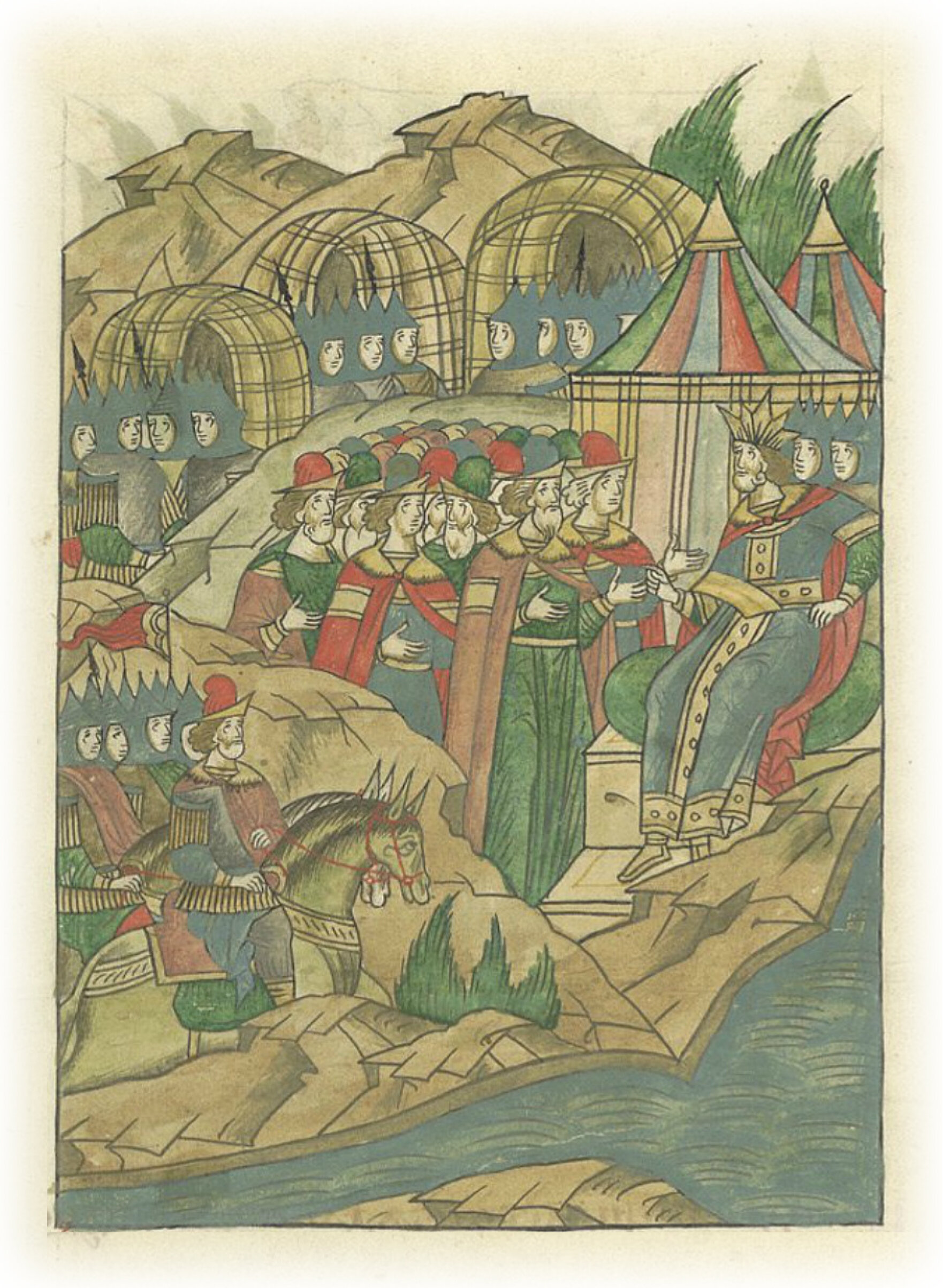 И пришел на устье реки Воронежа, и тут остановился с силами своими, кочуя. И было воинства его очень много, и поэтому назывался не великий князь Мамай, но от всех ближних его назывался великий царь Мамай, и гордость (в нем) была великая, и ожидания выше меры.