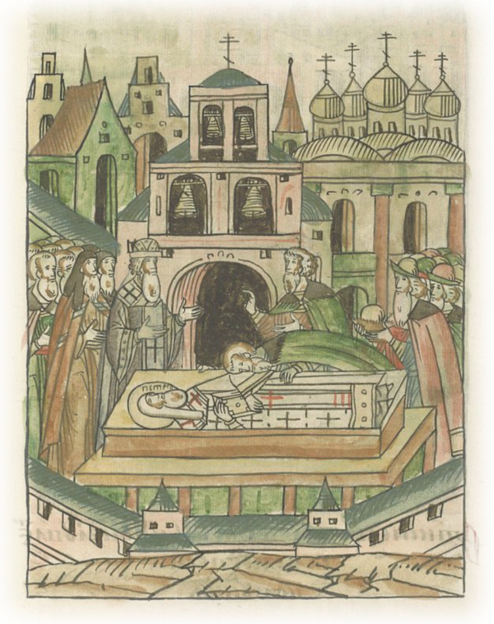 Также по окончании молебного пения князь великий крестится у цельбоносного образа, который лежал на раке блаженного святителя Петра, и говорит отцу своему митрополиту: «Кому повелеваешь нести мощи великого чудотворца Петра?»