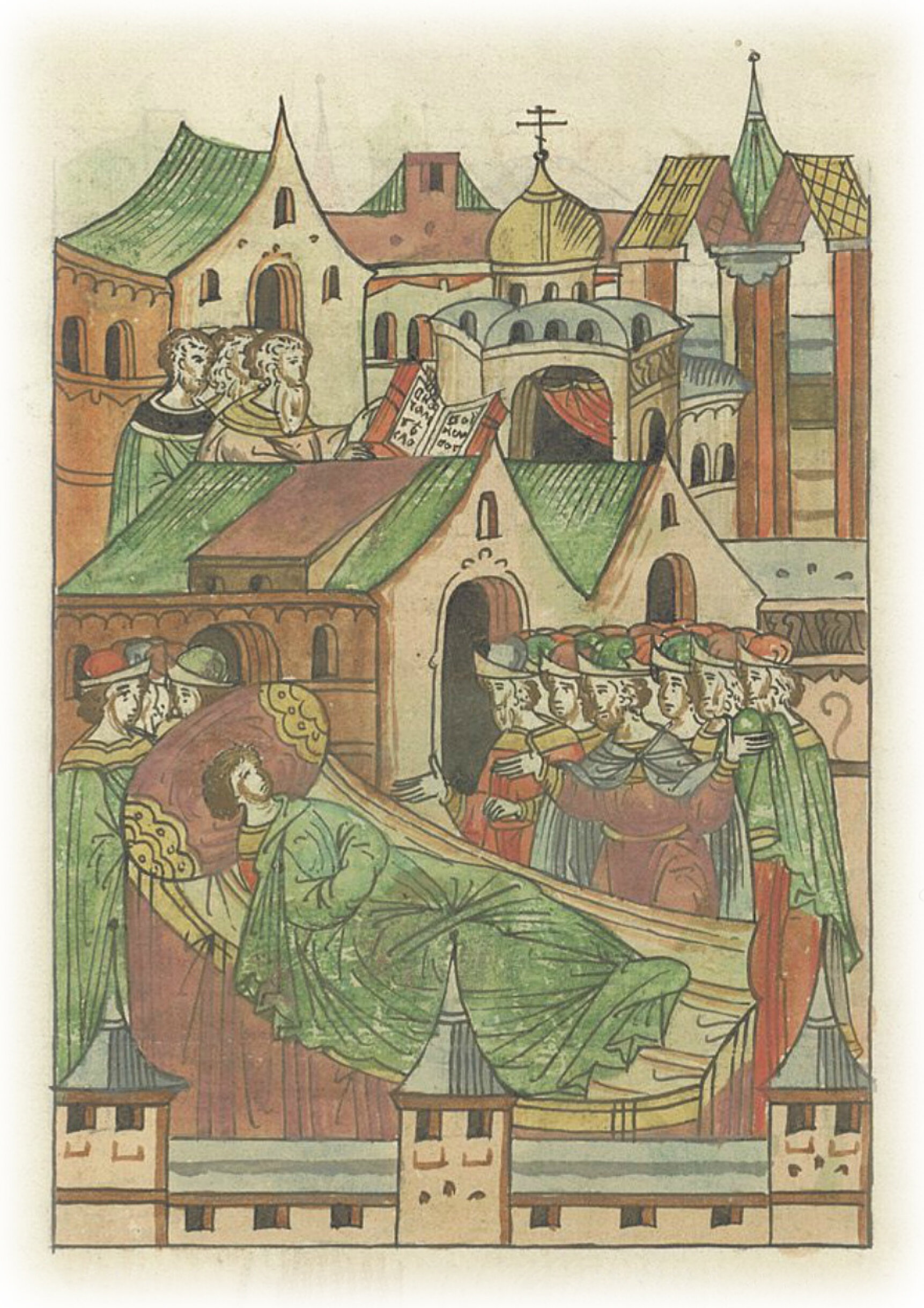 О кончине князя Дмитрия Юрьевича Красного. Князь перестает говорить и затем окончательно испускает дух.