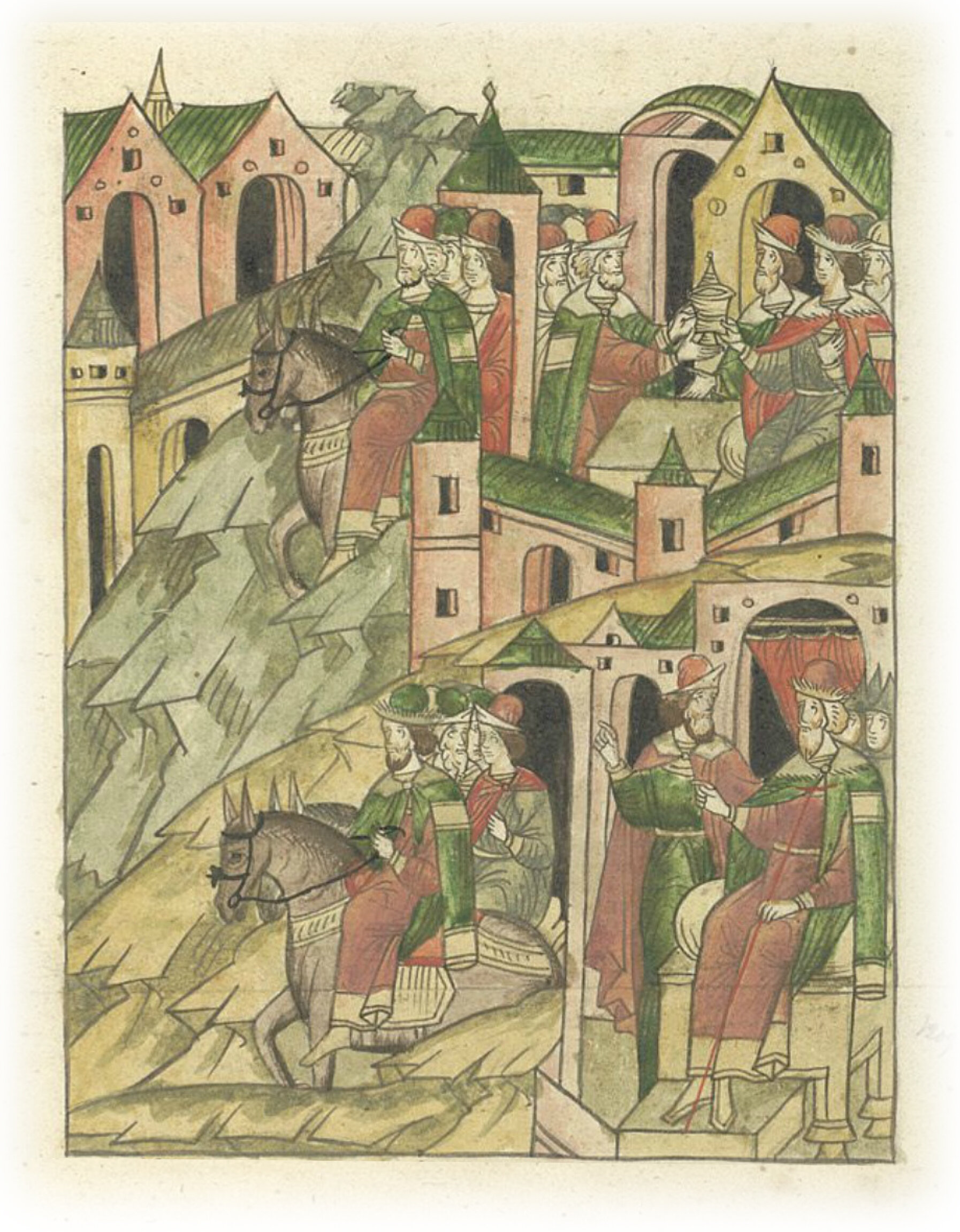 Великий князь Михаил Александрович Тверской отпускает своего сына князя Ивана в Орду. Посол Сары-хожа, приняв дары и почести от великого князя Дмитрия Ивановича, возвращается в Орду.