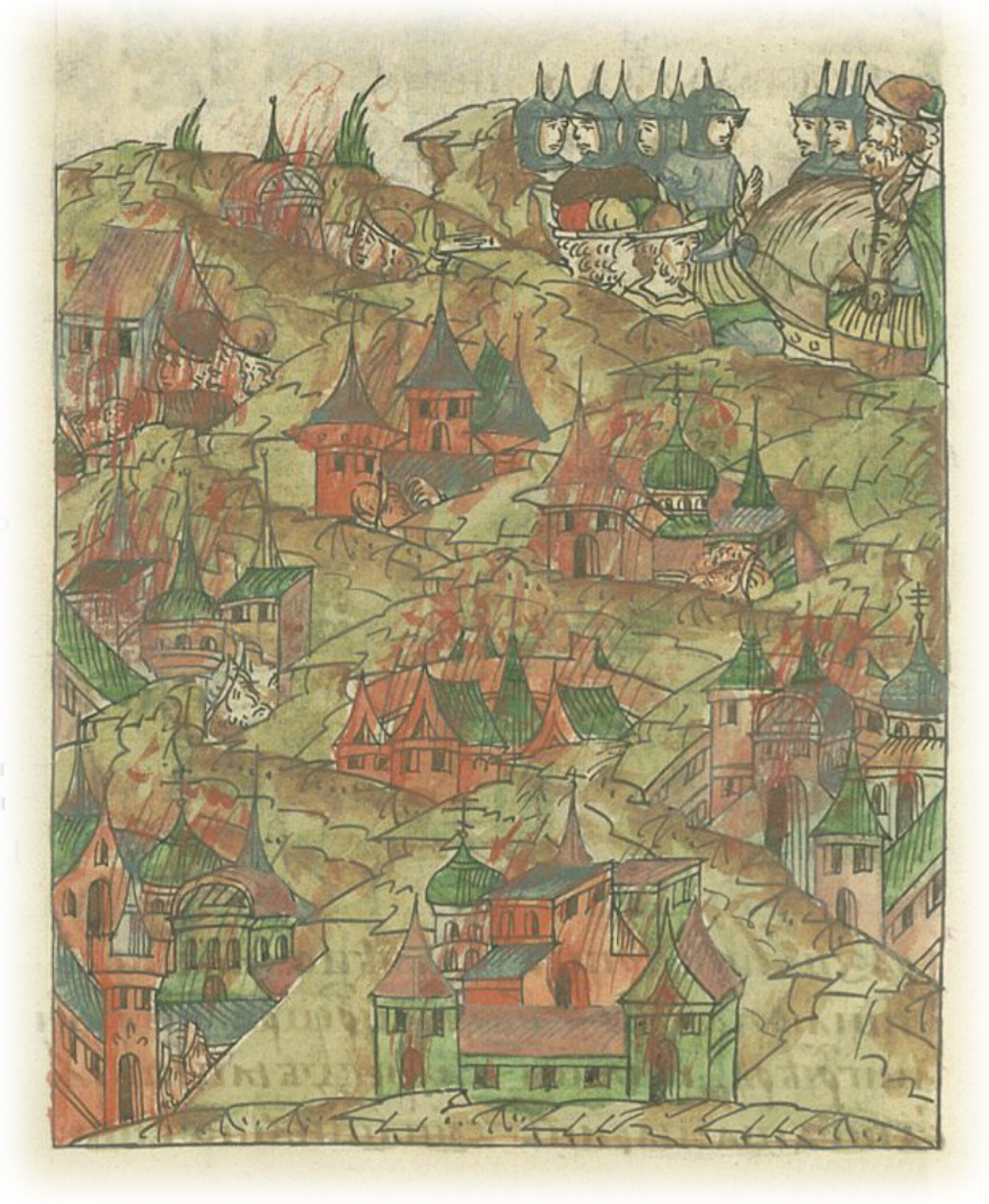 Взяли и город Переяславль, сожгли его, и Ростов, и Дмитров, и Серпухов, и Верею, и Нижний Новгород, и Городец, многие земли и села пленили и сожгли, а много христиан умерло во время той зимы: тогда была очень холодная и студеная зима, сильные вьюги и ветры. А гордый князь Свидригайло со своей храброй литвой никого из иноплеменников не победил, сломилось их оружие и вся воинская хитрость. Едыгей же пленил всех князей.
