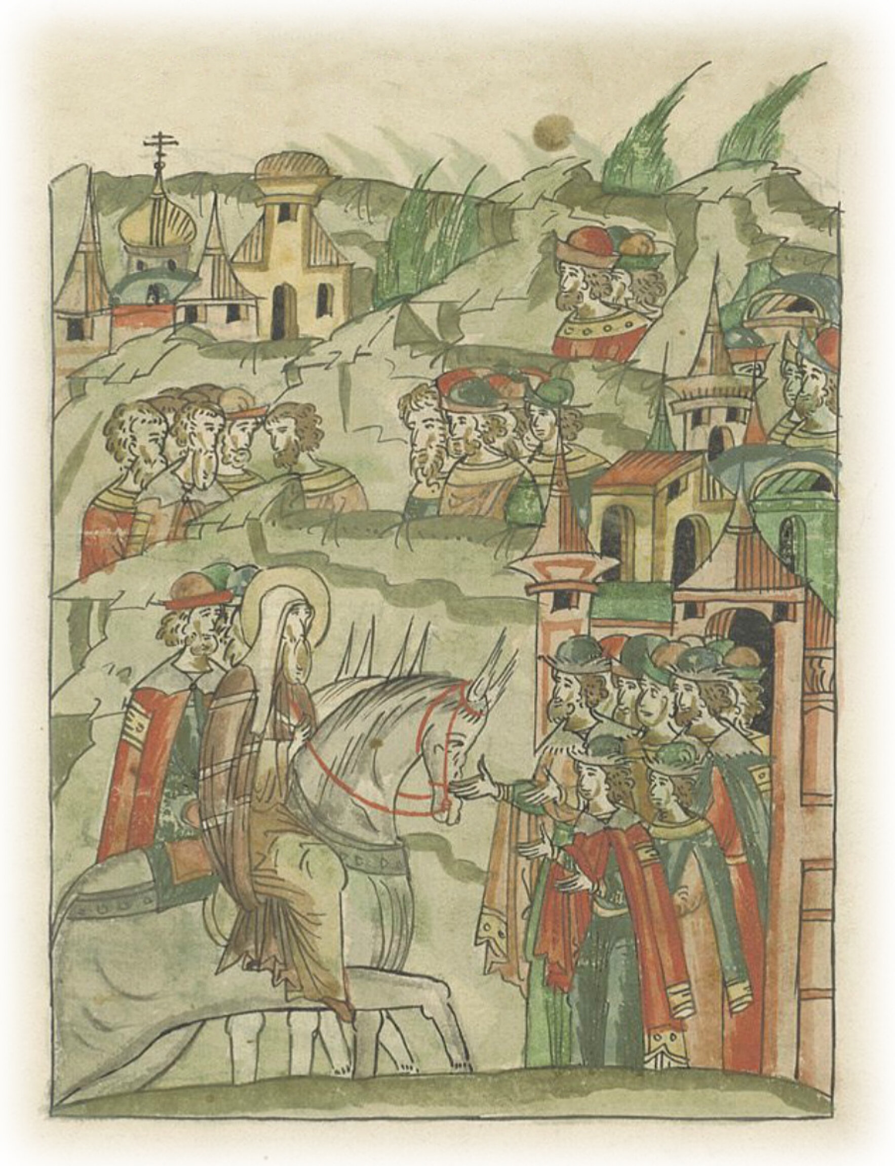 А князь Юрий Дмитриевич, услышав об этом, собрал всю отчину свою и встретил его с детьми своими и с боярами, и с лучшими людьми своими; а чернь всю собрал из городов своих и волостей, и из сел, и из деревень, и было их многое множество; и поставил их на горе у города, по приезде митрополита рассказывая и показывая ему многих людей своих.