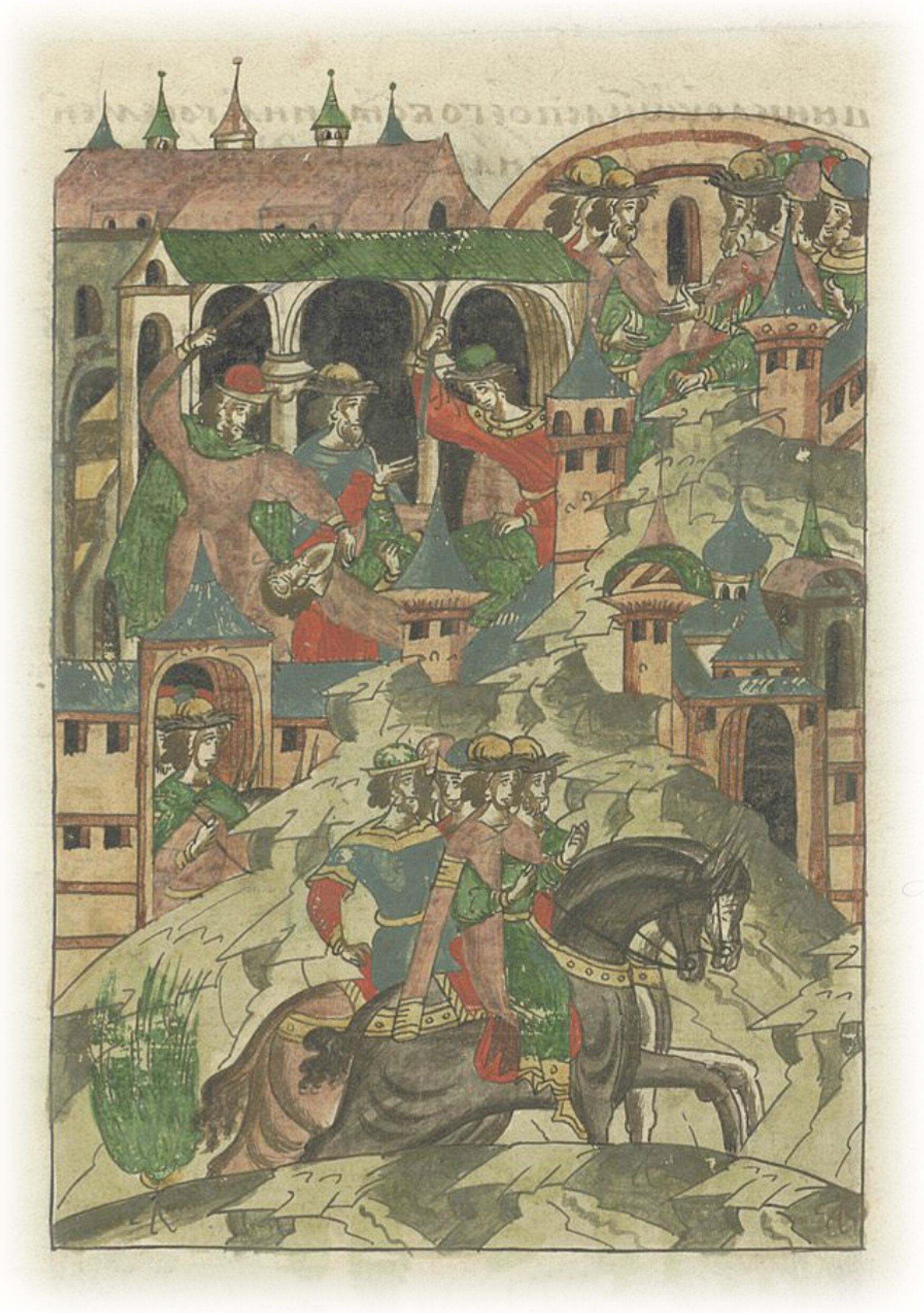 Увидели же дети князя Юрия князья Василий Косой, Дмитрий Шемяка и Дмитрий Красный, что не осталось у их отца никого из москвичей, очень оскорбились этим и смутились. И тогда князья Василий Косой и Дмитрий Шемяка Юрьевичи убили любимца своего отца боярина Семена Морозова в набережных сенях*, говоря: «Ты, злодей, крамольник, устроил эту неприятность нашему отцу и всем нам! Издавна ты известен как крамольник и лиходей». И, убив его, оставили мертвым, а сами пошли к Костроме. * сени с видом на реку.