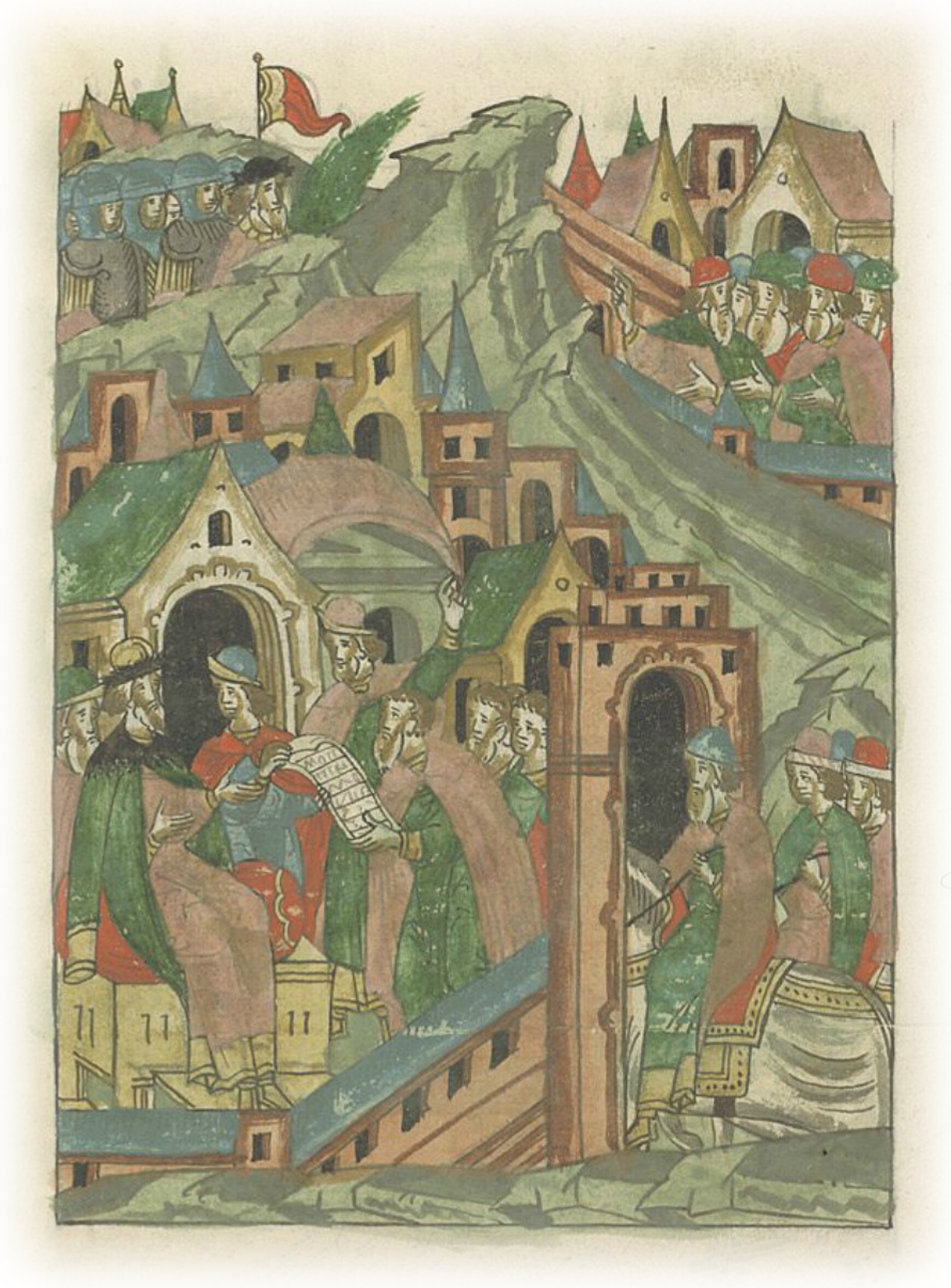 Ругодивские посадники Яким и Захар приезжают в Москву. Воеводы царя Ивана Васильевича Алексей Адашев и Иван Михайлов сообщают им, что государь пожалует их, если сдадут его воеводам помимо Ругодива Вышгород.