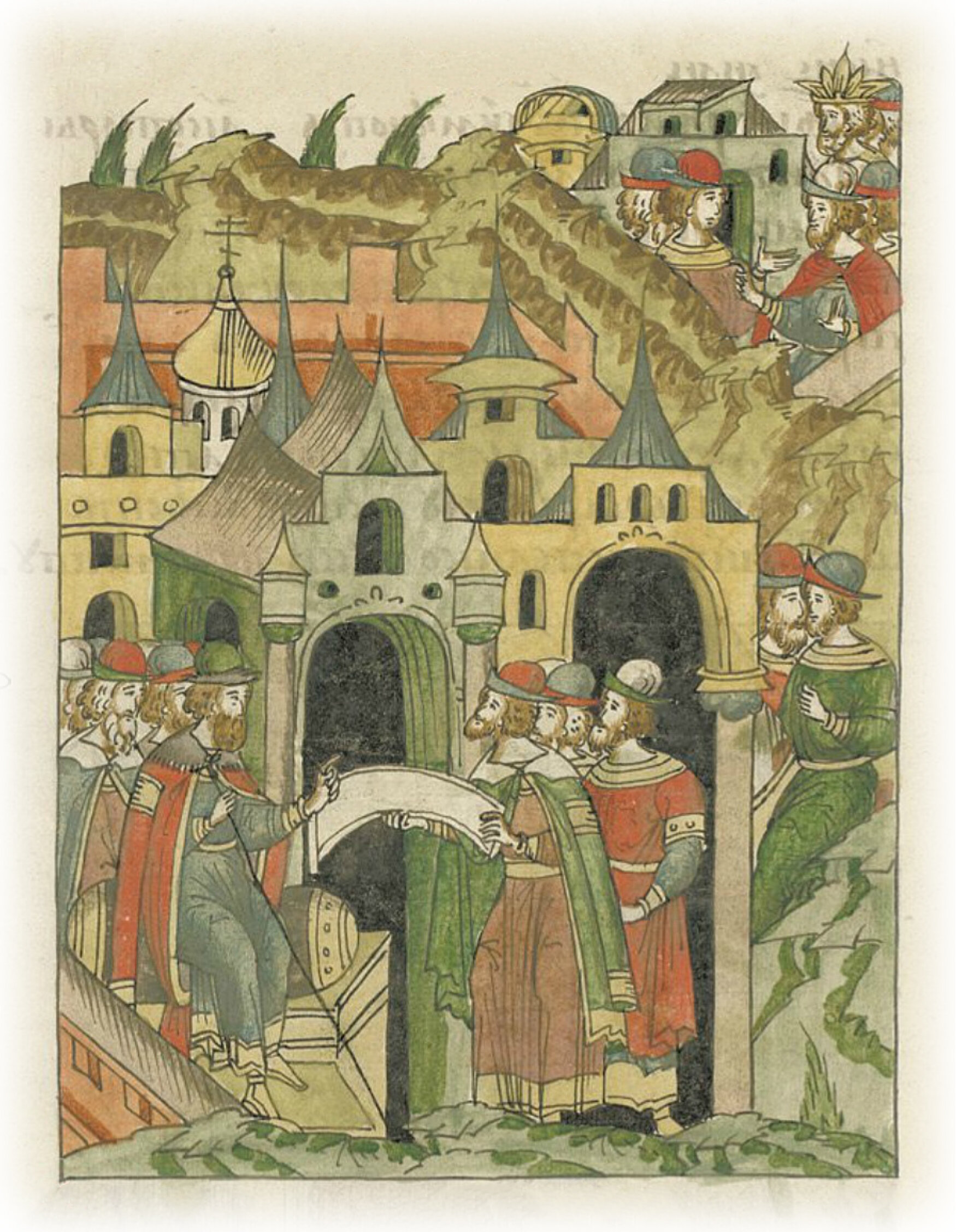 Ругодивские посадники Яким и Захар приезжают в Москву. Воеводы царя Ивана Васильевича Алексей Адашев и Иван Михайлов сообщают им, что государь пожалует их, если сдадут его воеводам помимо Ругодива Вышгород.