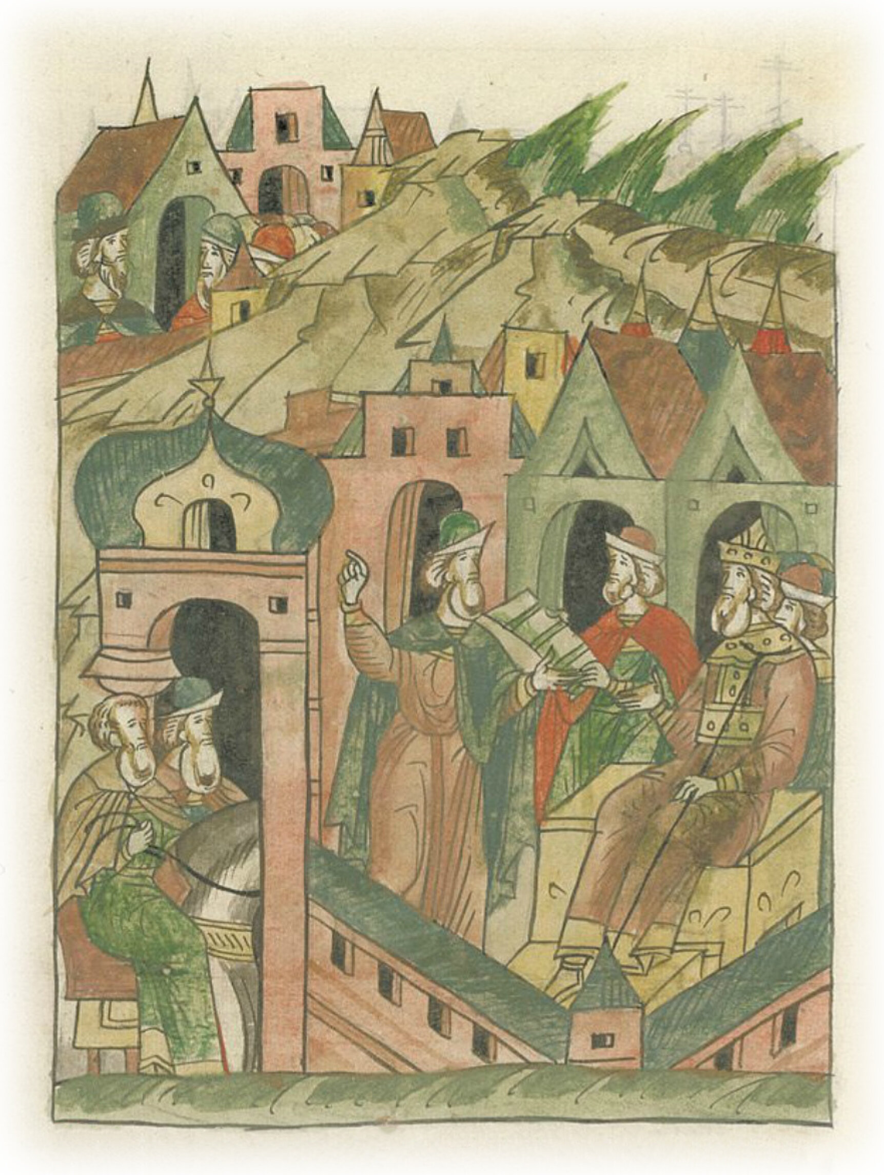 Ругодивские посадники Яким и Захар приезжают в Москву. Воеводы царя Ивана Васильевича Алексей Адашев и Иван Михайлов сообщают им, что государь пожалует их, если сдадут его воеводам помимо Ругодива Вышгород.