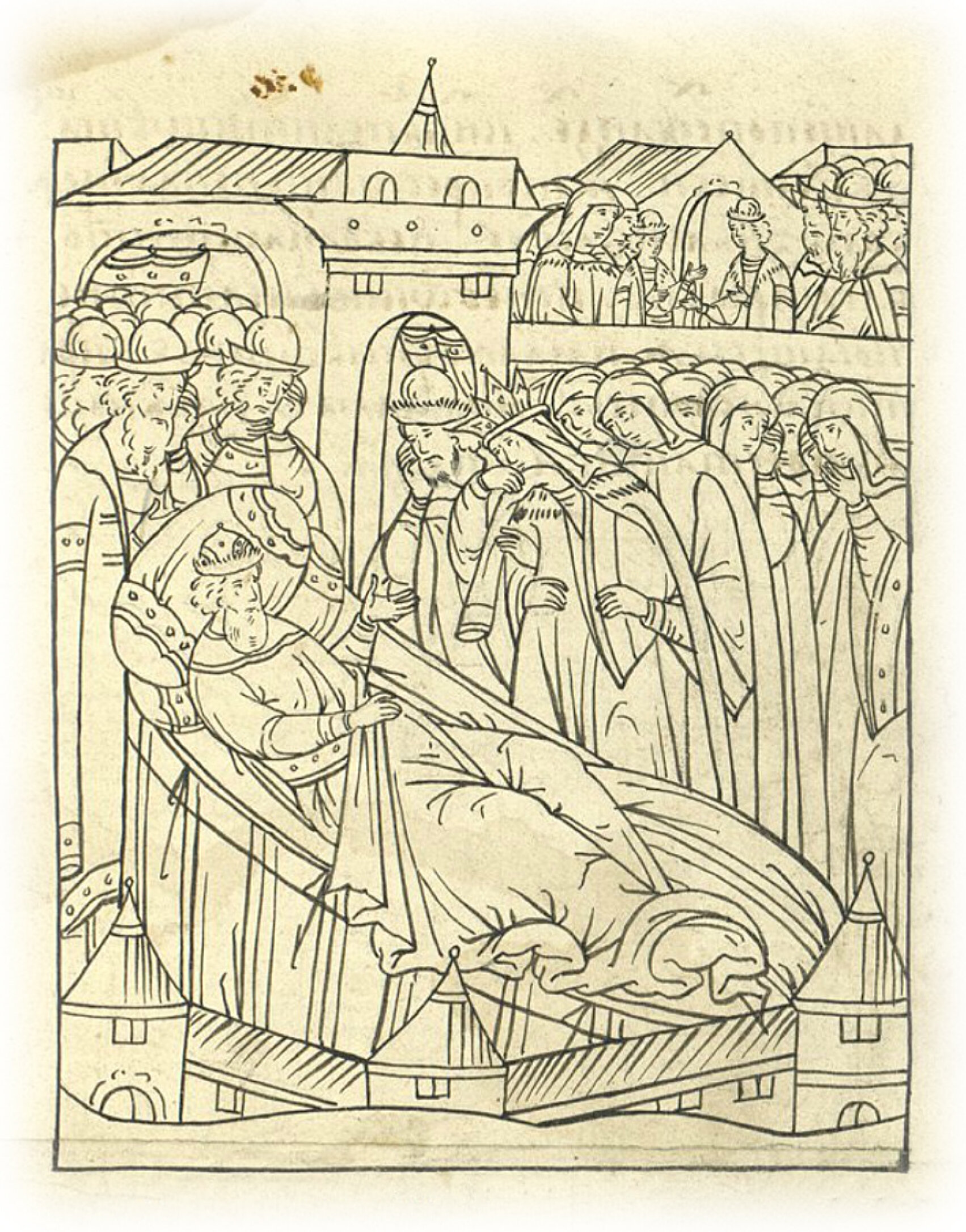 Потом же и сама великая княгиня пришла к самодержавному своему супругу, плачущая горько, огненные слезы испуская и умильные слова жалостно говоря; едва сдерживали ее брат его князь Андрей Иванович, а с другой стороны боярыня Елена, жена Ивана Андреевича Челяднина. Билась же великая княгиня и плакала горько, слезы же ее непрестанно текли из очей ее, словно великий источник; много же было слез, плач и рыдание во всех людях. Князь же великий утешал ее, говоря ей: «Жена! Перестань, не плачь, болезнь моя полегчала, не болит у меня ничего, благодарю Бога», потому что князь великий уже не ощущал себя. И немного утешив ее краткими словами, и на некоторое время унял, повелел перестать ей плакать.