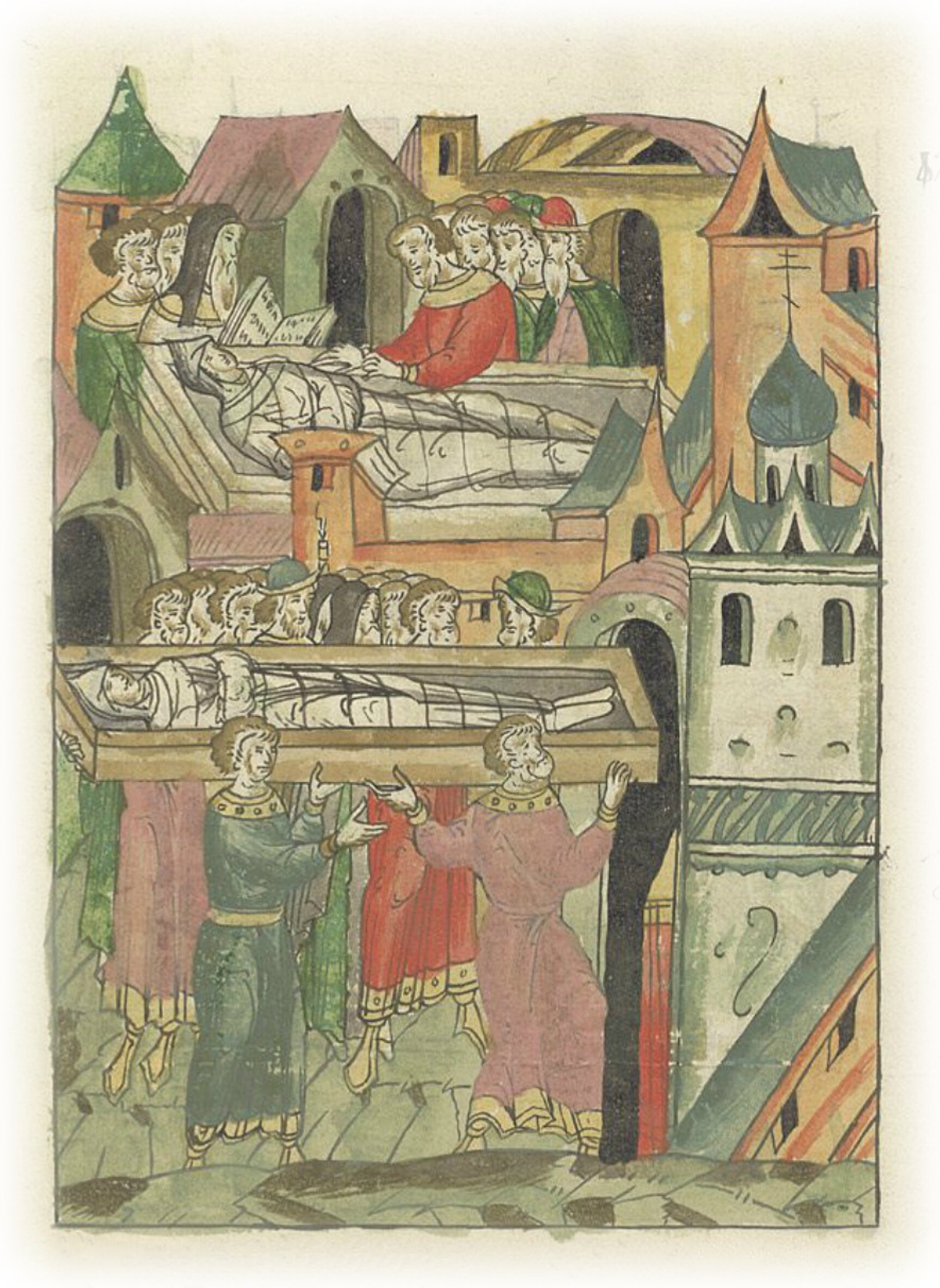 О кончине князя Дмитрия Юрьевича Красного. Тело князя относят в церковь святого Леонтия.