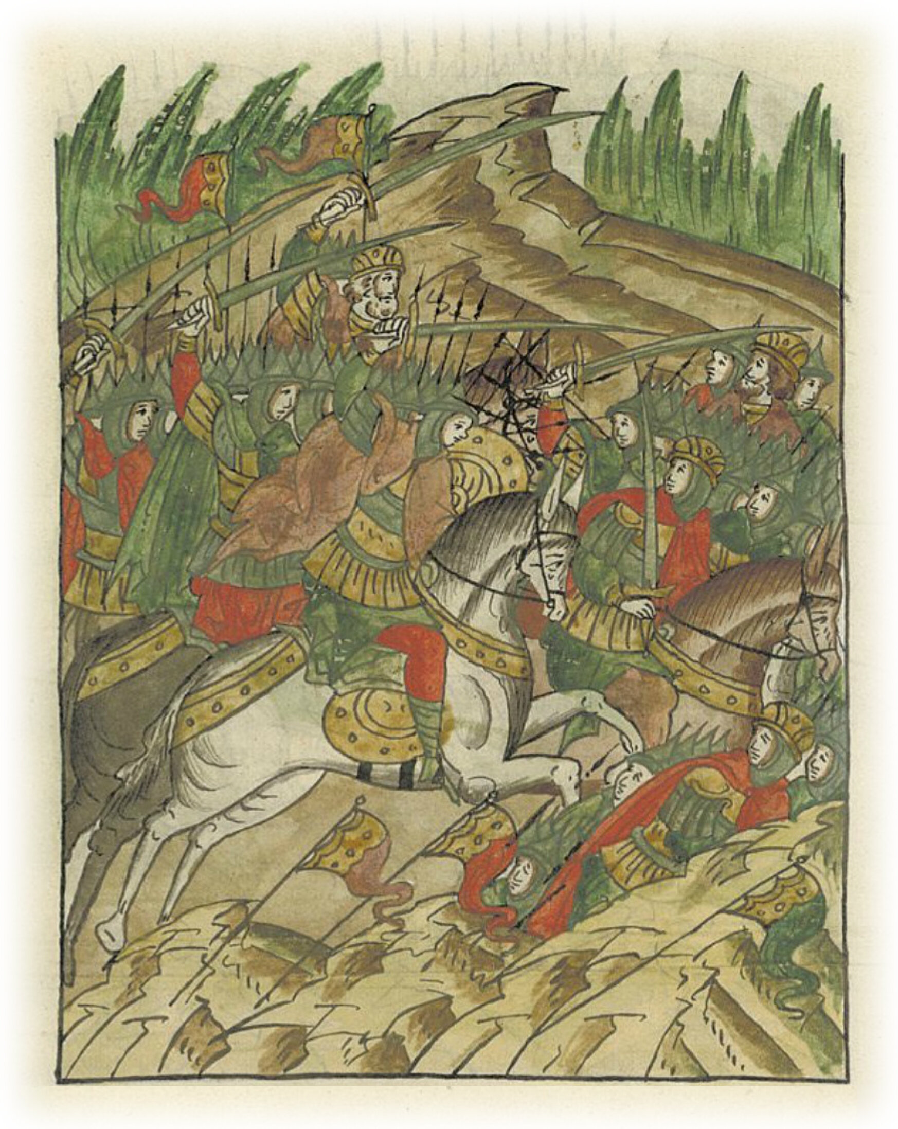 и быстро пошли против них, и сразились с полком князя Олега, стяги его потоптали, а сына его Давида зарубили.