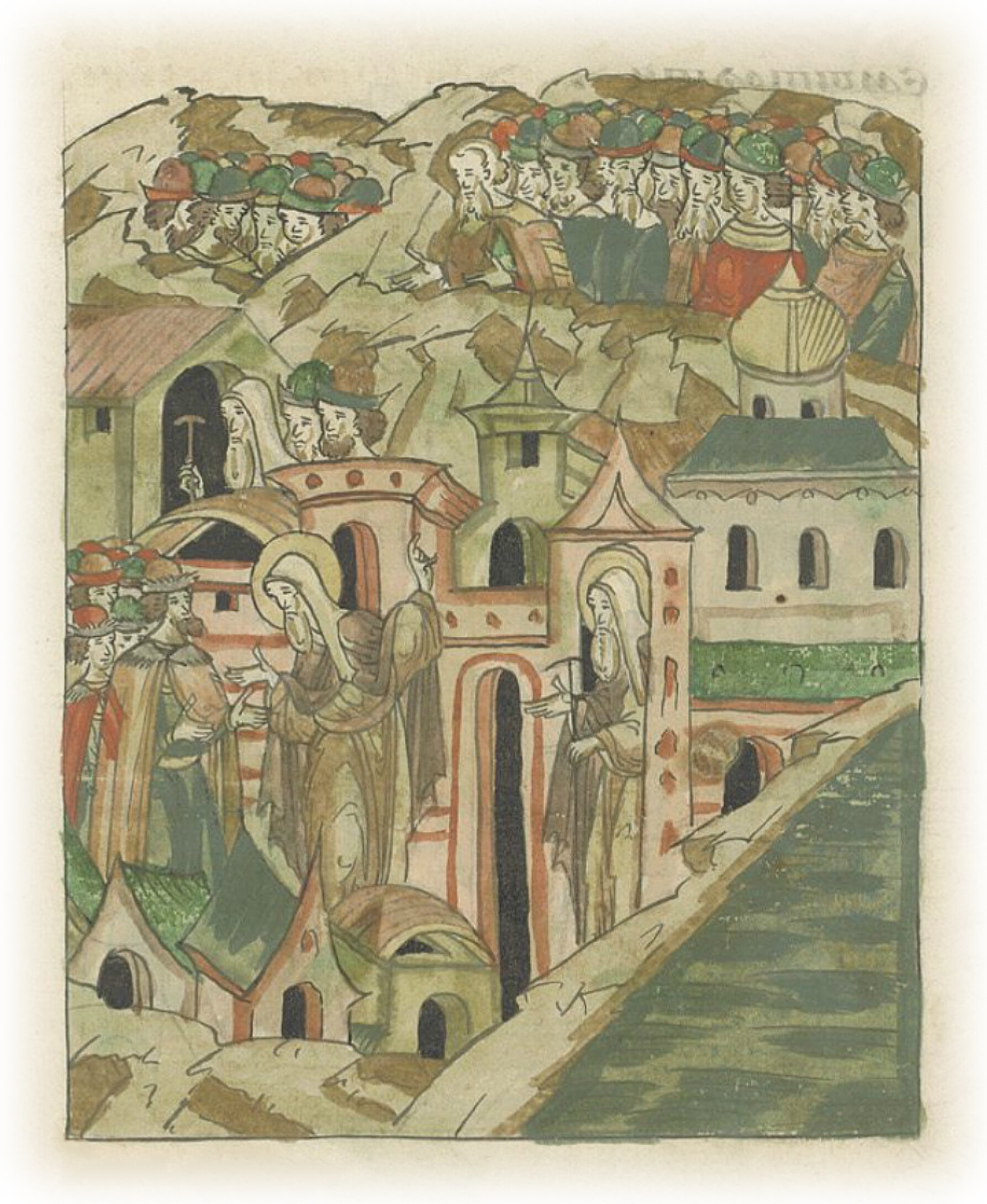И придя в церковь, помолился и вышел, и посмотрел на тот народ, стоявший на горе, и сказал князю Юрию Дмитриевичу: «Сыне, князь Юрий, не видал столько народа в овечьей шерсти», ибо все были в сермягах. Ведь князь Юрий хотел показать, как много имеет людей; святитель же принял это за глумление над собой; и потом пошел к келье своей, где он остановился.