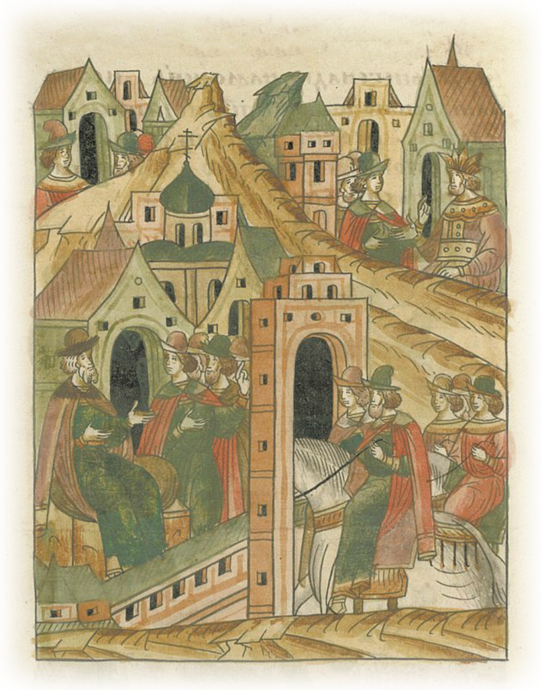 К великому князю приходят послы от царя Шиахмата, его брата Хозя-Салтана и Богатыря-Салтана.