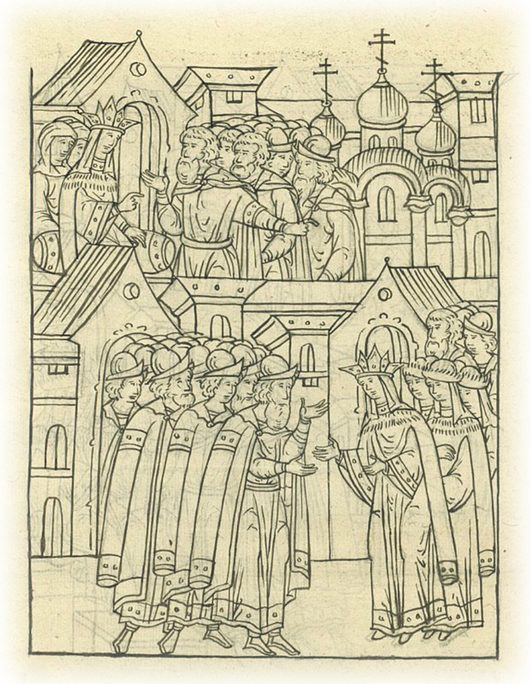 Царица Шигалея просит бояр великого князя ходатайствовать о приеме ее великой княгиней Еленой.