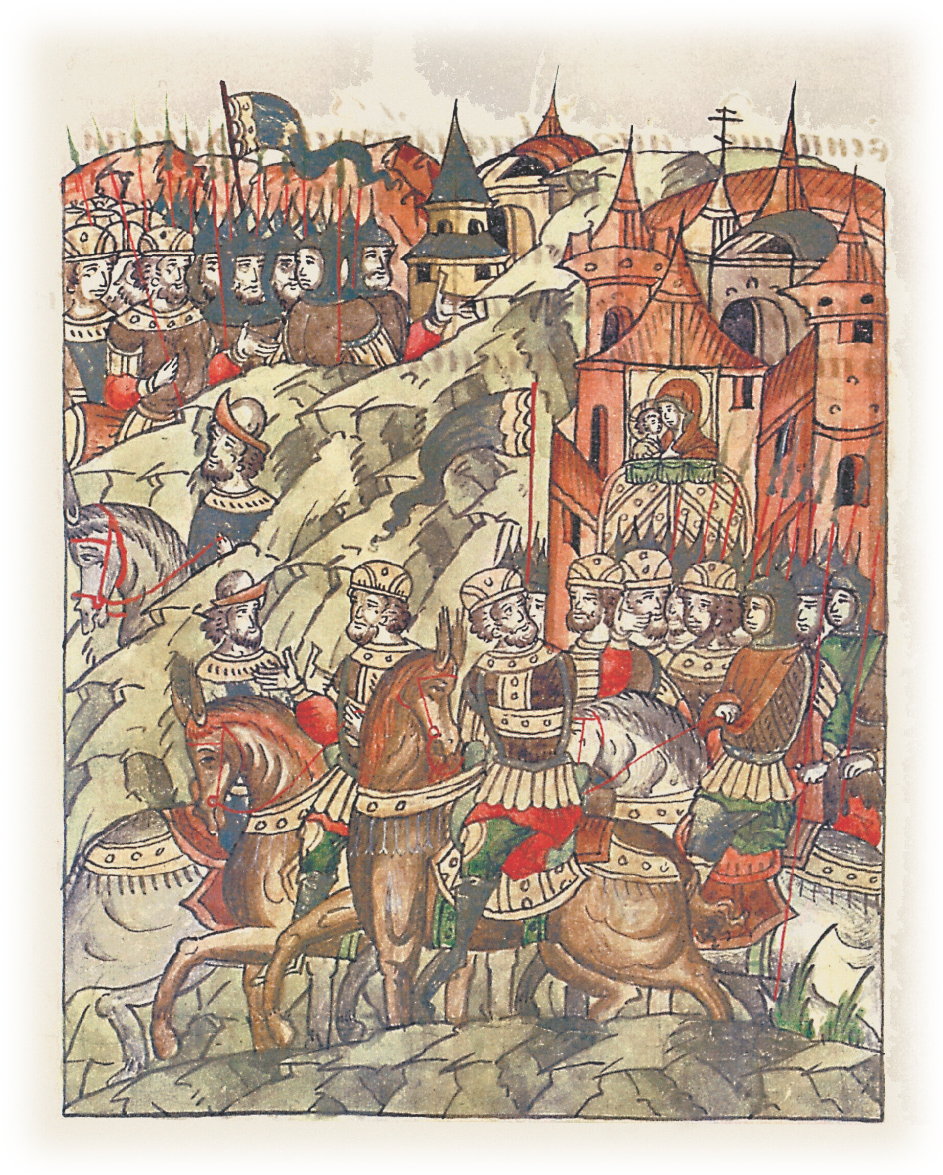 Вячеслав же сказал: «У тебя сынов семь, и я их от тебя не отгоняю, а у меня только два сына: Изяслав и Ростислав, а другие младше; но ради Русской земли и ради христиан, пойди, брат, в свой Переяславль и в Курск с сыновьями своими, а кроме того там у тебя Ростов Великий и прочие города; а Олеговичей отпусти, и договоримся сами, а кровь христианскую не прольем; последуешь ли по своему замыслу, как уже пошел?» И, посмотрев на образ святой Богородицы, написанный на Золотых воротах, продолжил: «Та Госпожа и Владычица наша Богородица с Сыном своим и Богом нашим (пусть) рассудит нас в этом веке и в будущем»; и, так сказав, отпустил к нему посла его.