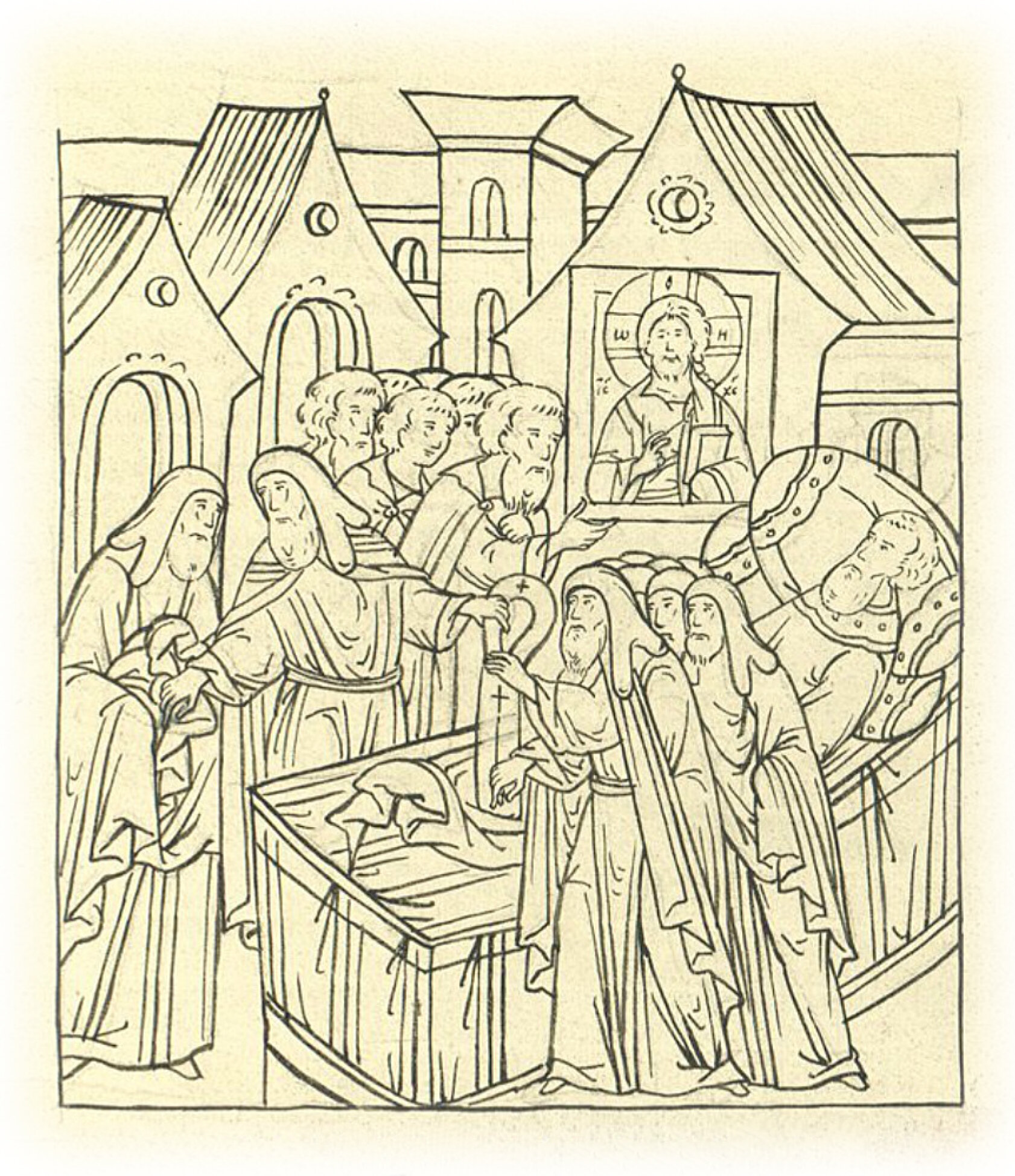 И пришел старец Мисаил с платьем, а князь великий приближался к кончине. Митрополит же взял епитрахиль и подал через великого князя игумену Троицкому Иоасафу.