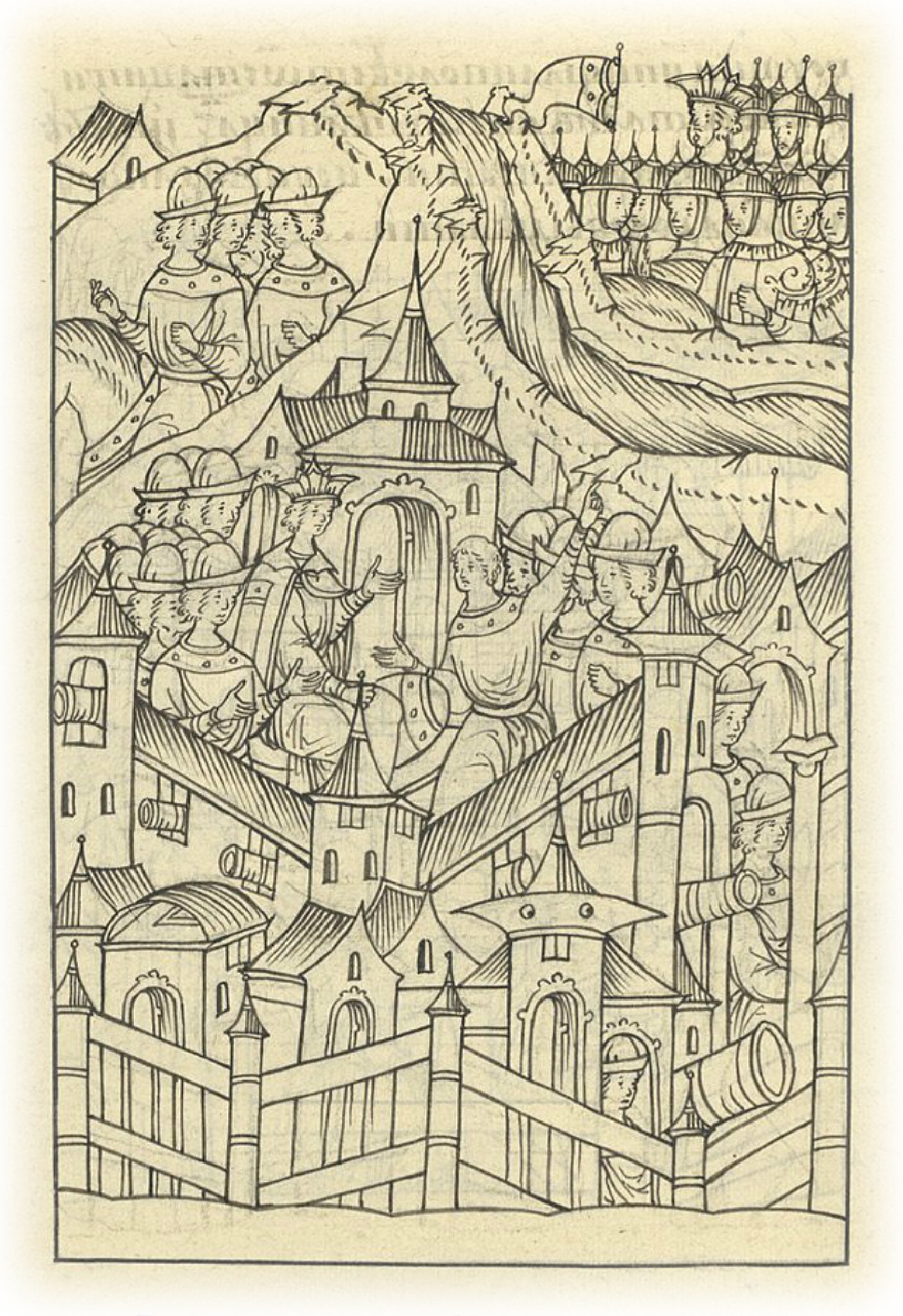 Языки говорят воеводам царя Ивана Васильевича, что магистр окопался большим рвом вокруг города Рындола, бьет из пушек и пищалей и приступает к Рындолу.