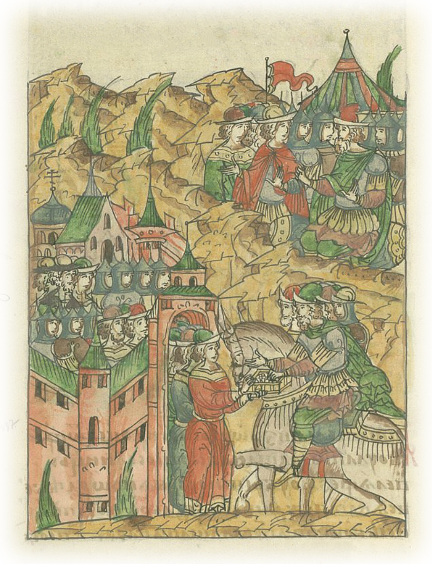 И сказал своей дружине: «Скоро мы пойдем в Орду, чтобы не лишиться царства, так как там некто, придя, хочет захватить наше царство, но здесь князь великий Василий, собрав войско, сможет нас победить, что будем делать тогда?» И вскоре послал в город, прося мира, примирился с горожанами, взяв выкуп в 3000 рублей.