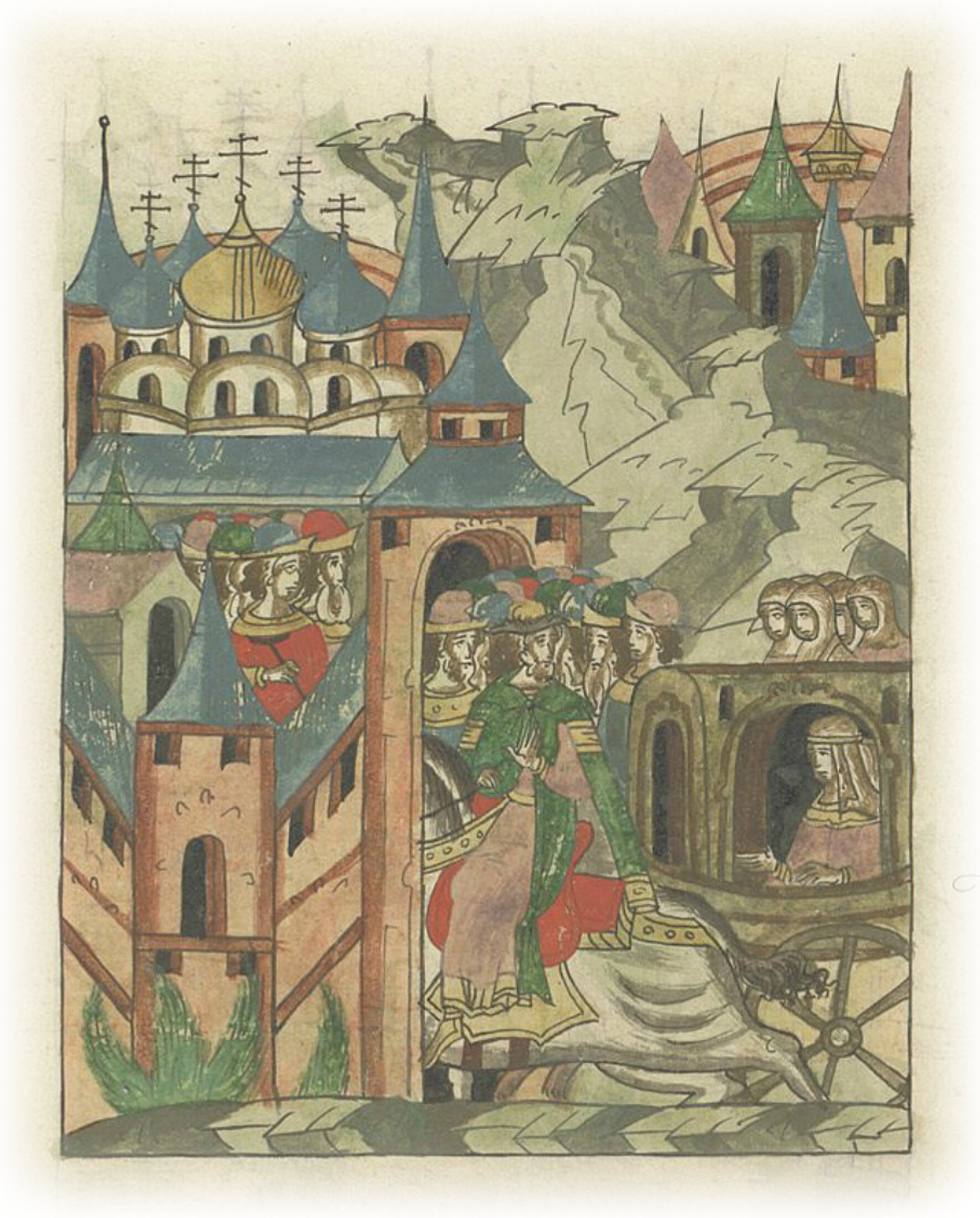 Князь Юрий Семенович со своею княгиней приезжают из Литовской земли в Великий Новгород.