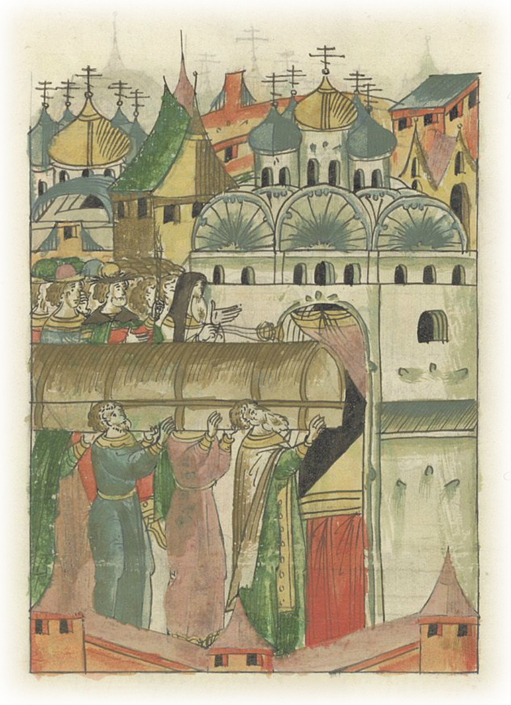 Похороны князя Дмитрия Юрьевича Красного. Тело князя относят в церковь архангела Михаила.
