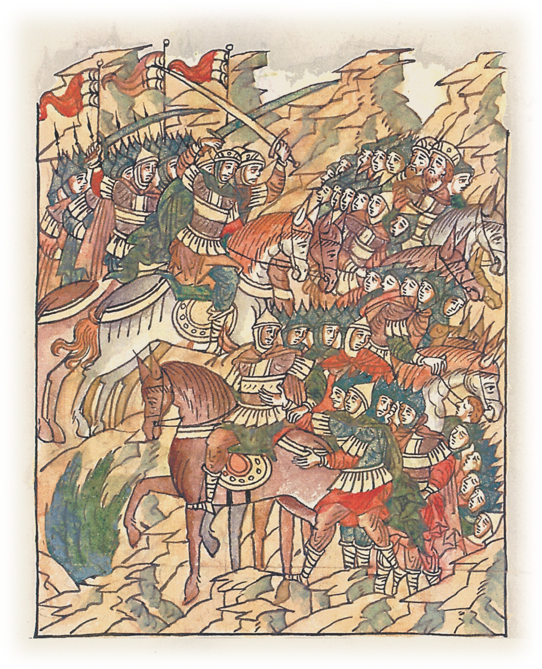 Князь же великий Ростислав Мстиславич и князь Святослав Всеволодович устрашились и задрожали, и побежали все; половцы же гнались за ними и секли их, и многих убили, а иных живых руками взяли.