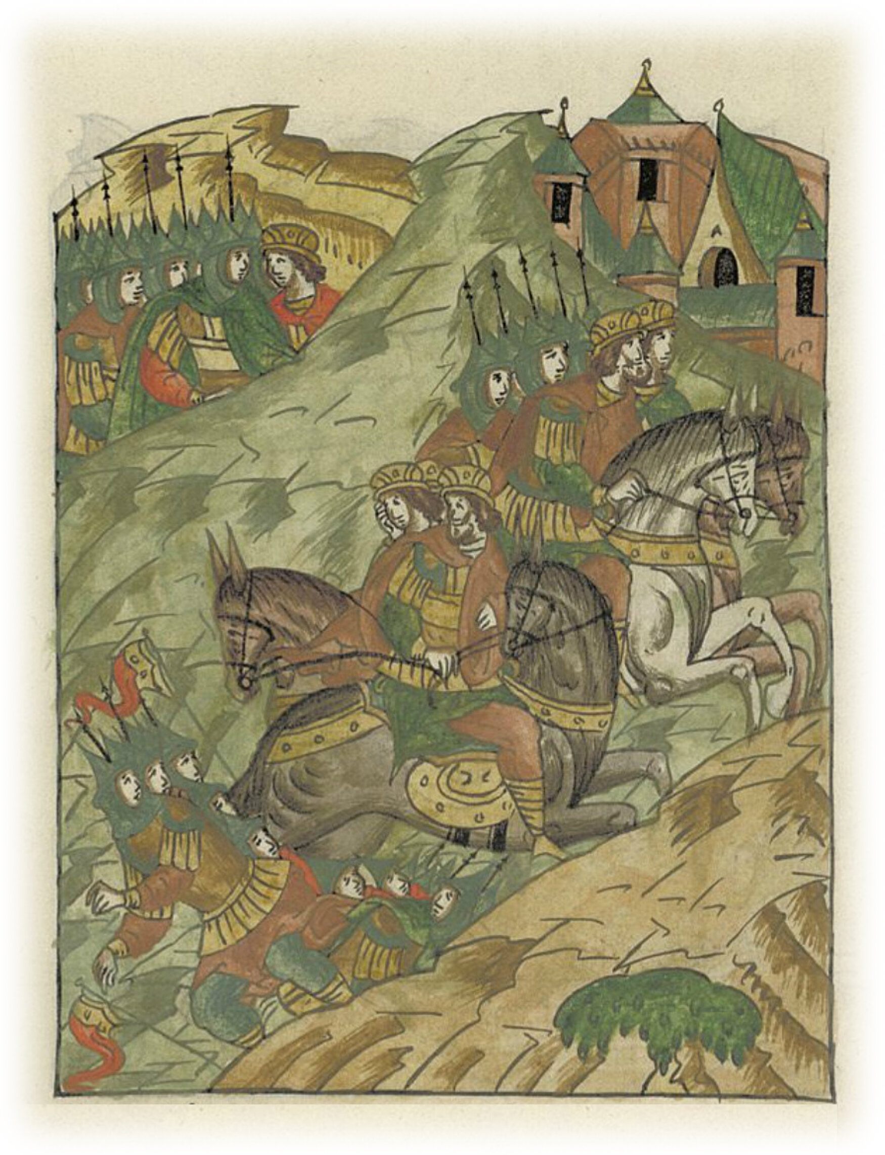 Языки говорят воеводам царя Ивана Васильевича, что магистр окопался большим рвом вокруг города Рындола, бьет из пушек и пищалей и приступает к Рындолу.