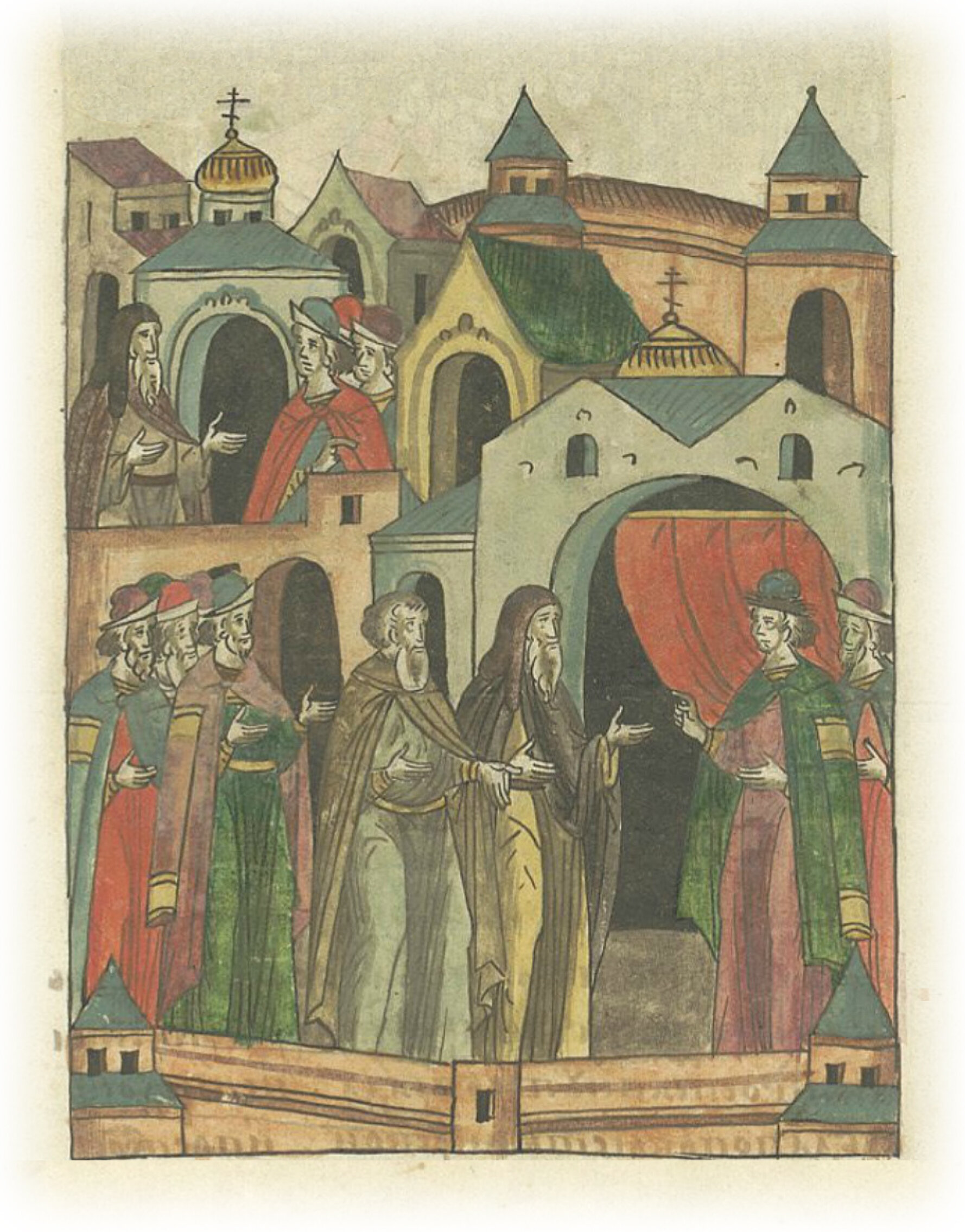 Митяй входит в церковь святого Спаса и посылает за чудовским архимандритом Елисеем, чтобы тот постриг его в иноческий чин.