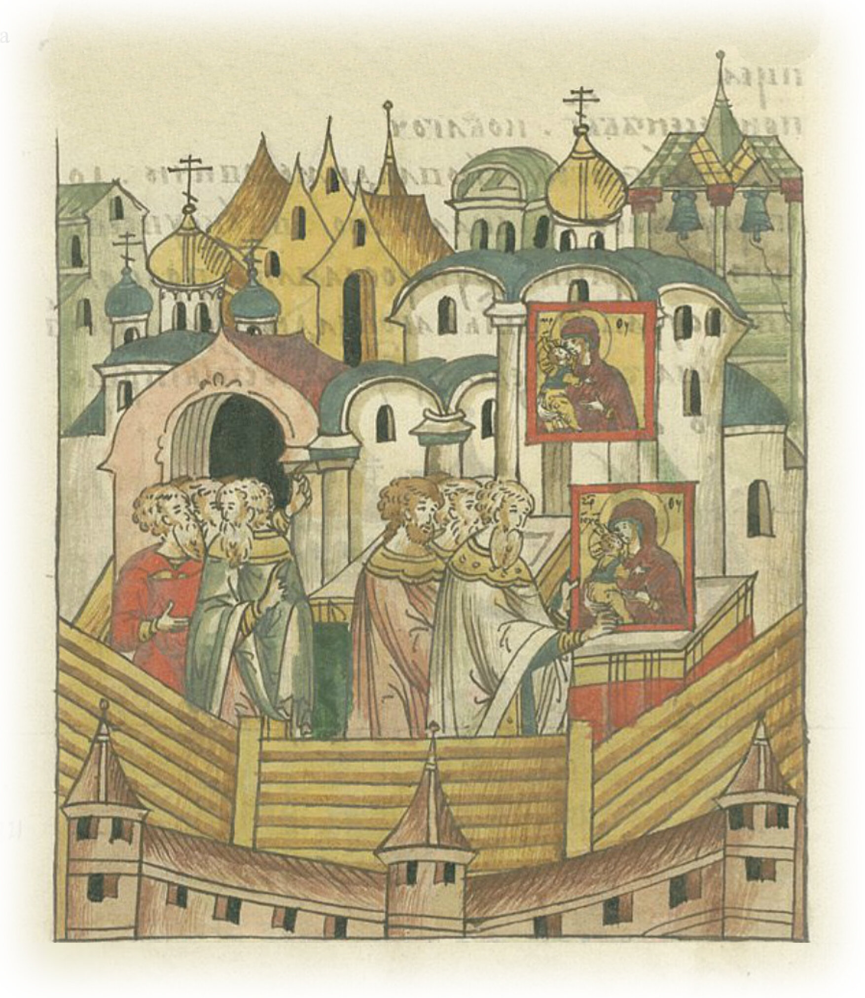 И потом поставлен был чудотворный тот образ Владычицы Богородицы по повелению этого благочестивого великого князя Георгия Владимировича в Вышгороде в церкви пречистой Богородицы, в Девичьем монастыре. Чудо о том, как клирики видели в воздухе икону Богородицы. В монастыре том, в церкви пречистой Богородицы, где был поставлен чудотворный образ Богоматери, случилось так, что однажды, когда клирики как обычно входили в церковь, увидели, что святая икона Богородичная сошла со своего места и встала посреди церкви, в воздухе. Тогда они дерзнули поставить ее на другое место.