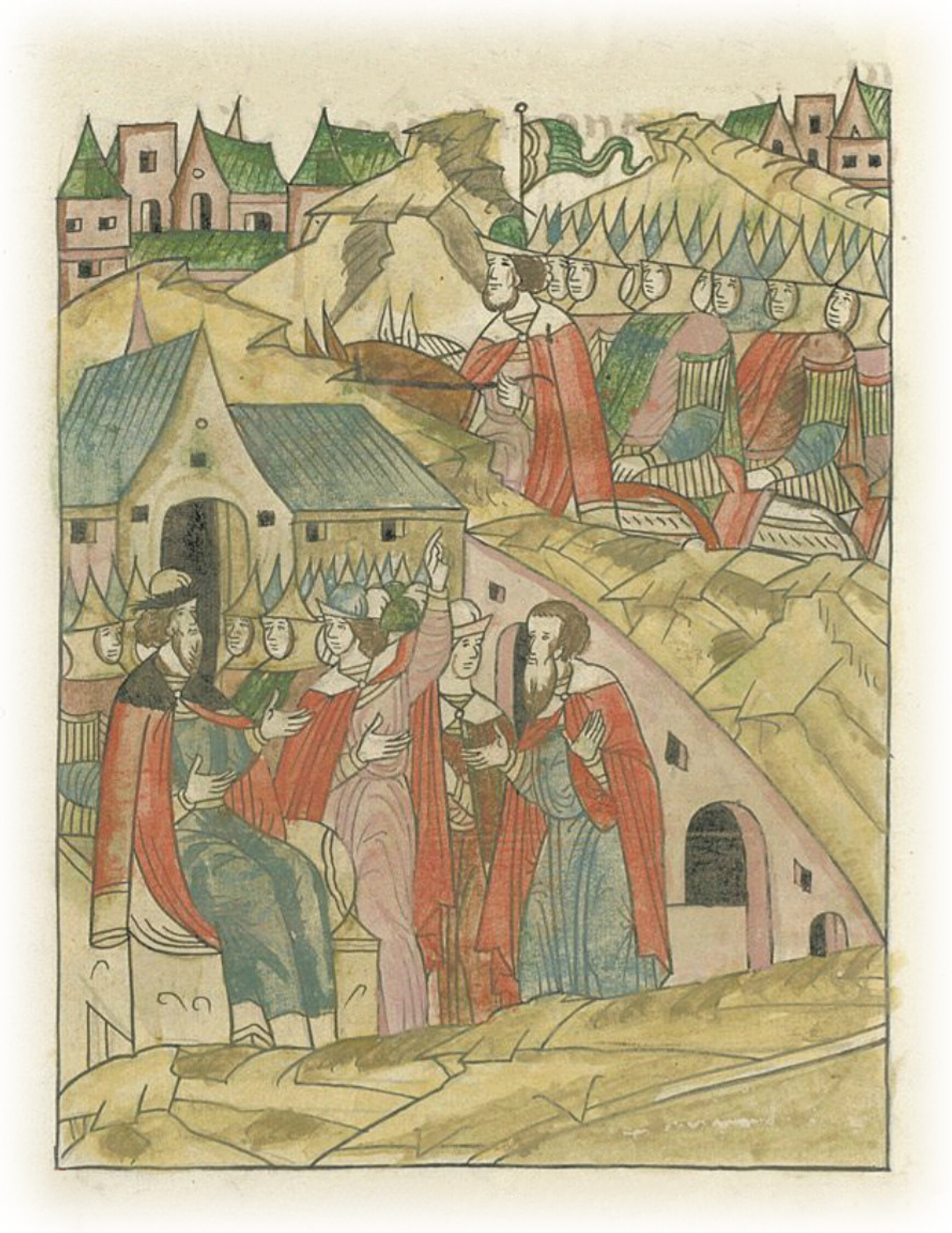 Языки говорят воеводам царя Ивана Васильевича, что магистр окопался большим рвом вокруг города Рындола, бьет из пушек и пищалей и приступает к Рындолу.