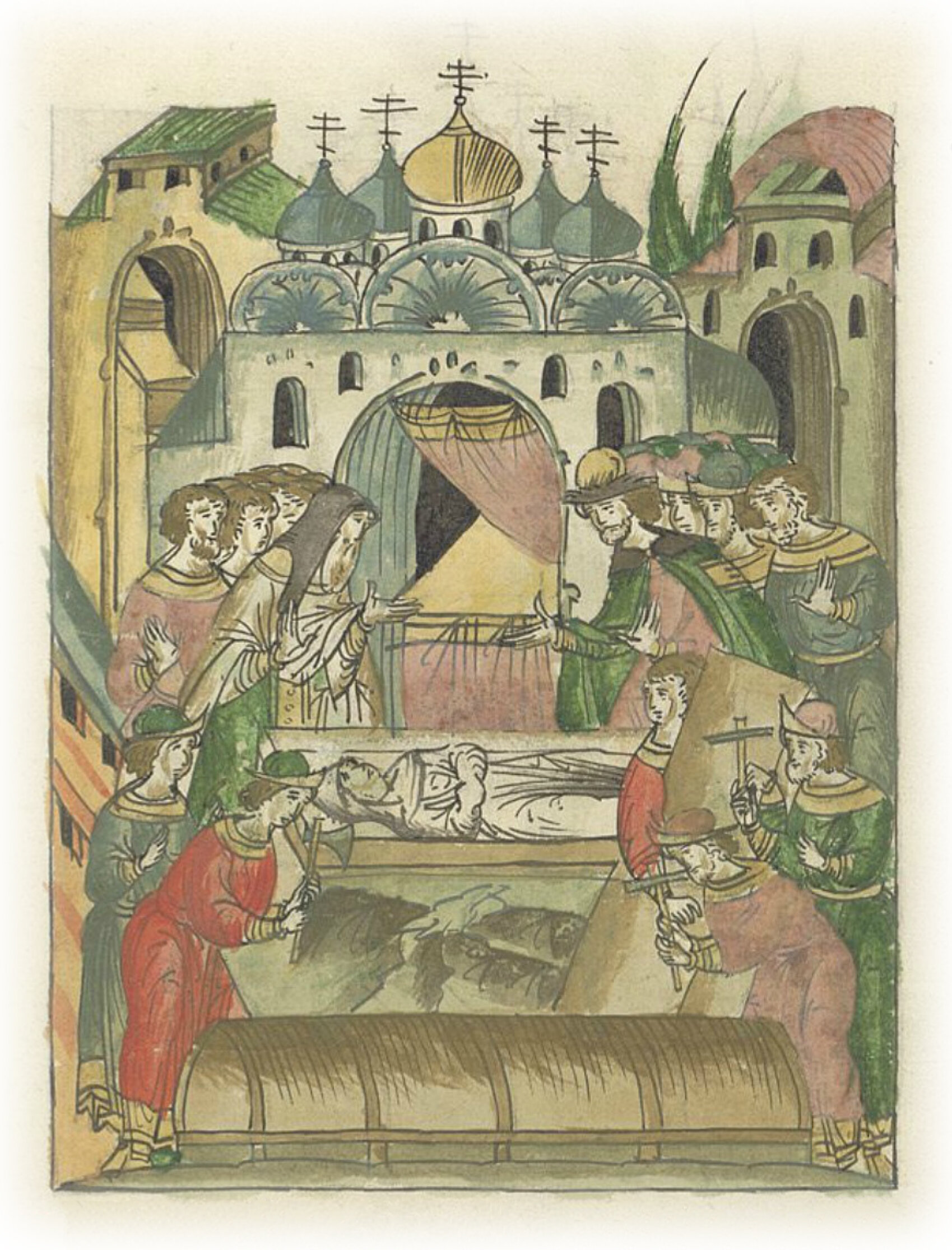 Похороны князя Дмитрия Юрьевича Красного. Рассечение колоды с телом князя.