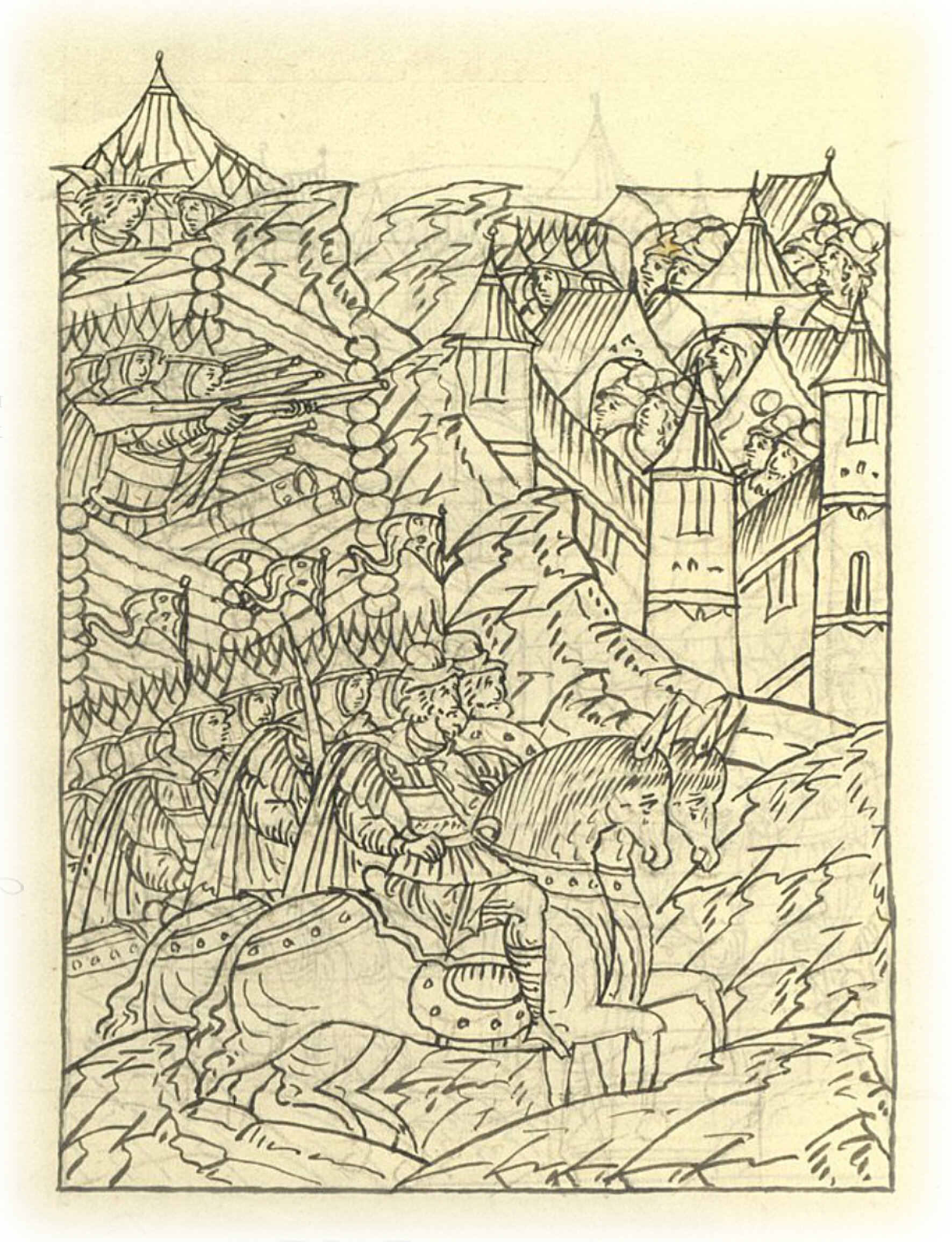 Языки говорят воеводам царя Ивана Васильевича, что магистр окопался большим рвом вокруг города Рындола, бьет из пушек и пищалей и приступает к Рындолу.