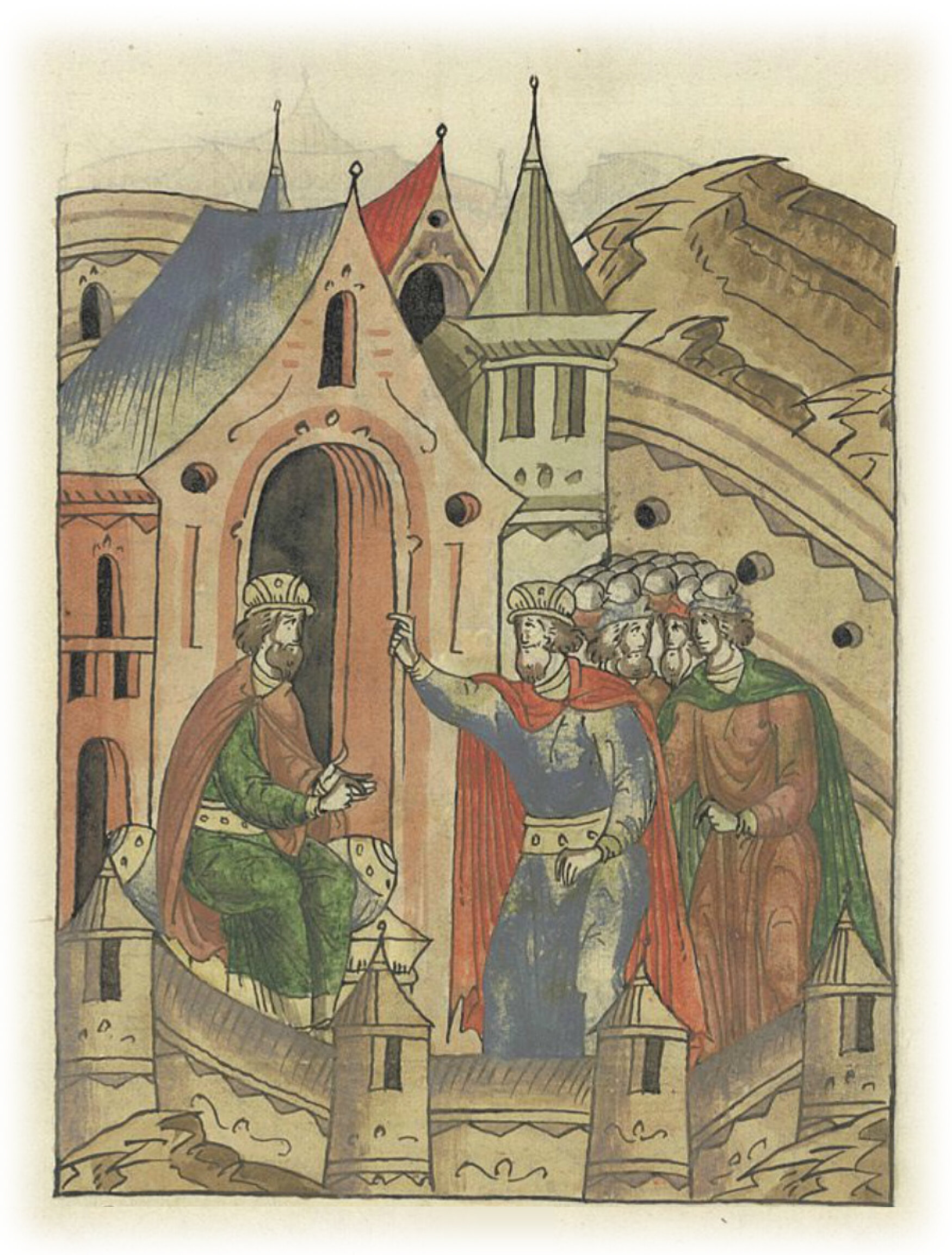 Ругодивские посадники Яким и Захар приезжают в Москву. Воеводы царя Ивана Васильевича Алексей Адашев и Иван Михайлов сообщают им, что государь пожалует их, если сдадут его воеводам помимо Ругодива Вышгород.
