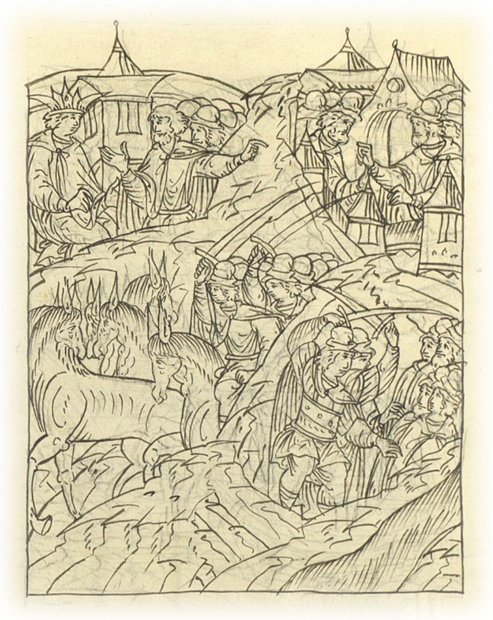 Языки говорят воеводам царя Ивана Васильевича, что магистр окопался большим рвом вокруг города Рындола, бьет из пушек и пищалей и приступает к Рындолу.