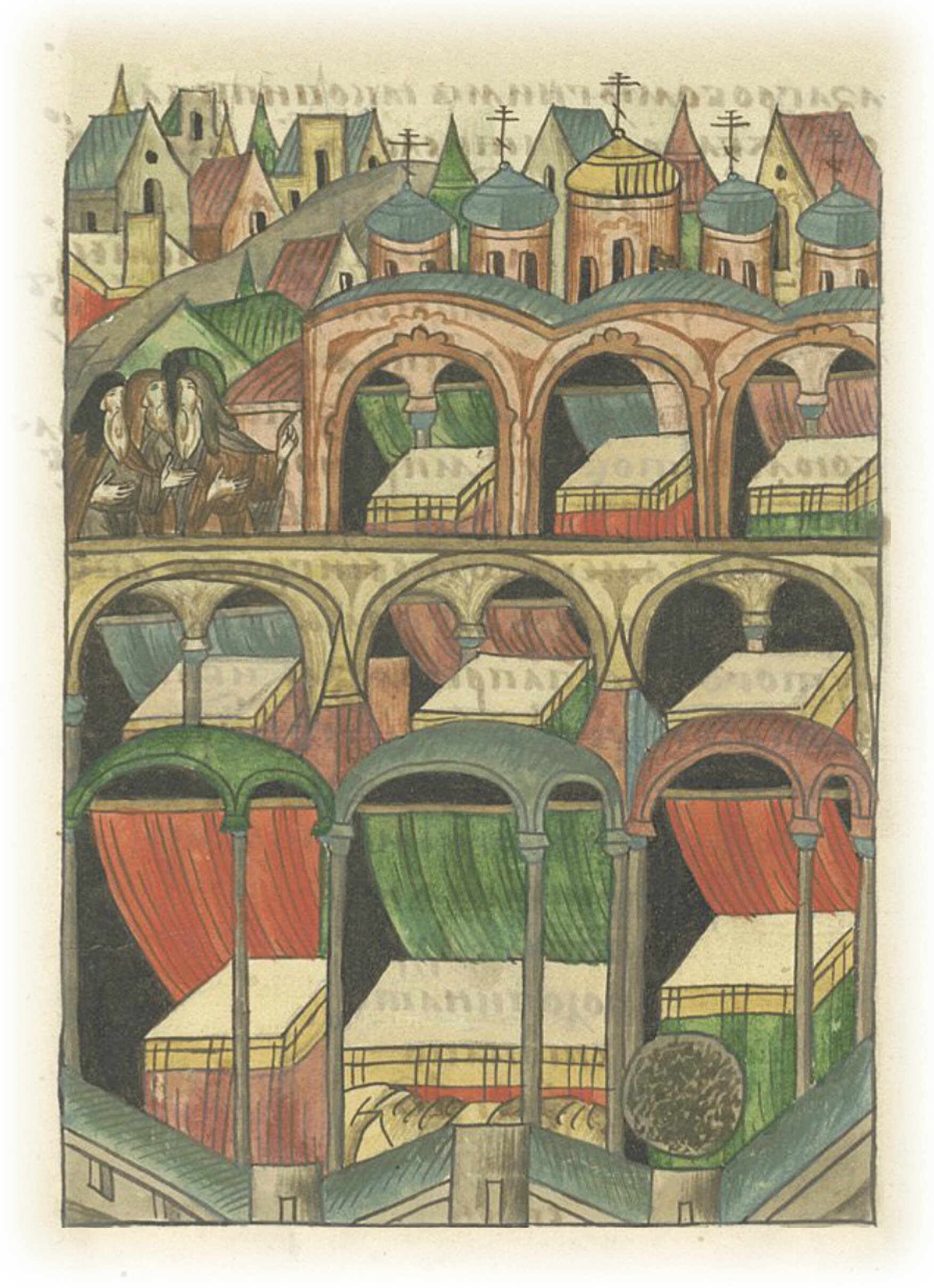 А с правой стороны от гроба Господня – римская служба, римляне служат. А на полатях с правой стороны армянская служба, армяне служат. А с правой стороны от гроба Господня на земле – фряжская служба, фряги служат. А оттуда – сирийская служба, сирияне служат. А за гробом Господним – яковитская служба, яковиты служат. А с левой стороны у гроба Господня – фряжская служба, фряги служат. А оттуда снова немецкая служба, немцы служат. А от той службы – снова фряжская служба, фряги служат. А под фряжскою службою место есть, где мироносицы сидели и ангела Господня видели, где ангел отвалил камень от дверей гроба. А во фряжской службе – пол-столпа: у того столпа был привязан и избиваем Господь наш Исус Христос в вольной его страсти, и поругались над ним. И сорок совершенных принял ран, подвергаясь смертельному наказанию. А другая половина того столпа в Царьграде, в Апостольской церкви.