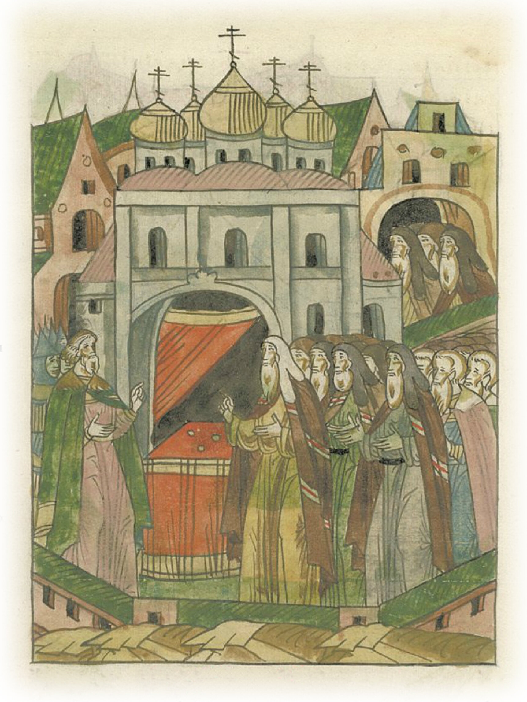 О жребиях на новгородское архиепископство. В то же лето (месяца) июля в 17 день великий князь всея Руси Иван Васильевич, посоветовавшись со своим (духовным) отцом митрополитом Геронтием, с Иоасафом, архиепископом Ростовским, и с епископами – епископом Рязанским Симеоном, епископом Коломенским Герасимом, епископом Сарским Прохором положили жребий на престол (с именами) Елисея, архимандрита Спасского, Геннадия, архимандрита Чудовского, и Сергия, старца Троицкого, на архиепископство в Великий Новгород.