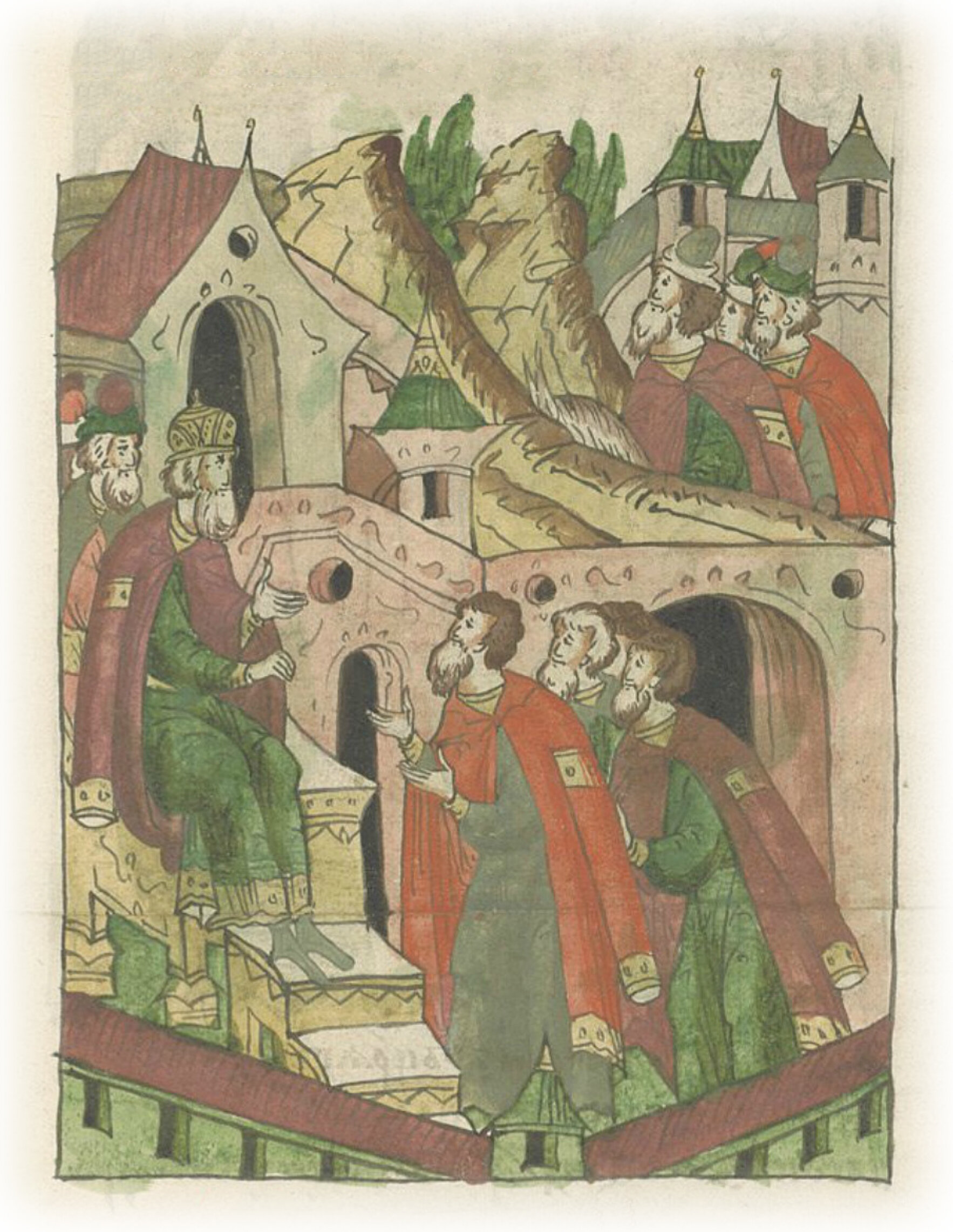 Ругодивские посадники Яким и Захар приезжают в Москву. Воеводы царя Ивана Васильевича Алексей Адашев и Иван Михайлов сообщают им, что государь пожалует их, если сдадут его воеводам помимо Ругодива Вышгород.